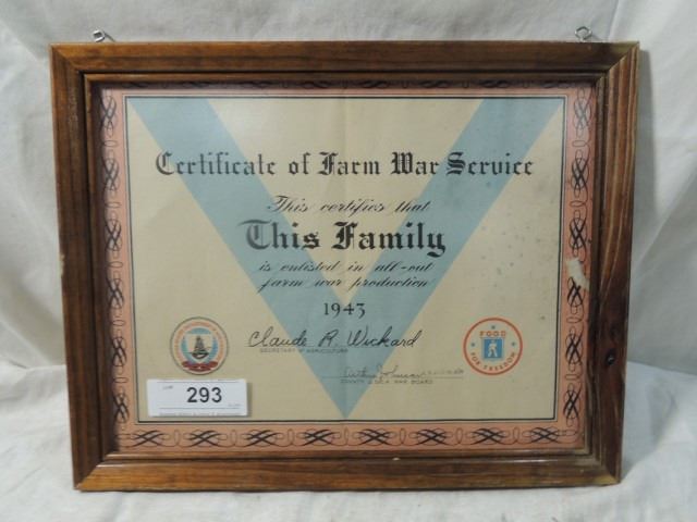 NICELY FRAMED, FOOD FOR FREEDOM, SPECIAL FARM AWARD, SIGNED BY CLAUDE WICKARD SECRETARY OF AGRICULTURE, AND ARTHUR JOHNSON COUNTY USDA WAR BOARD. VERY COOL!!