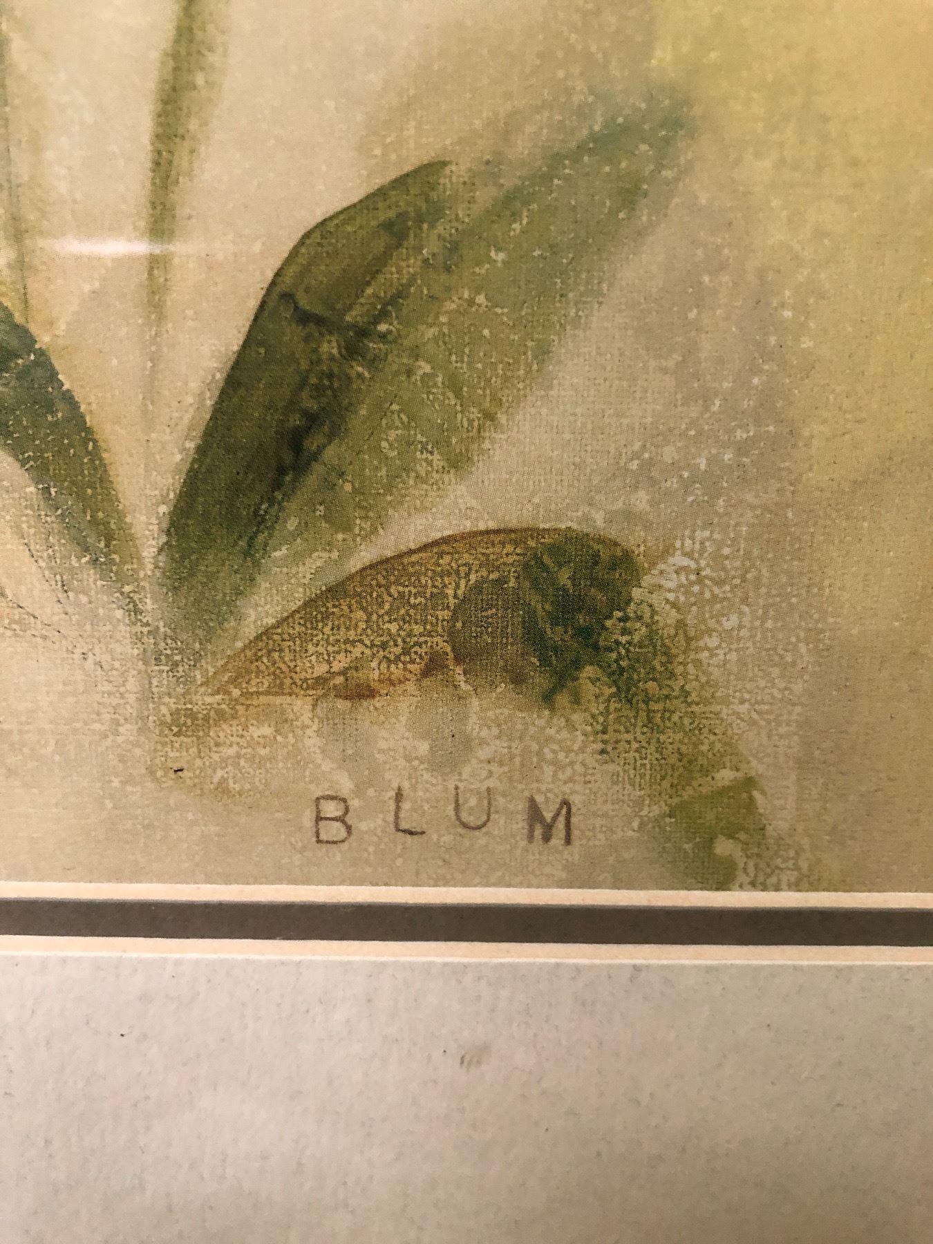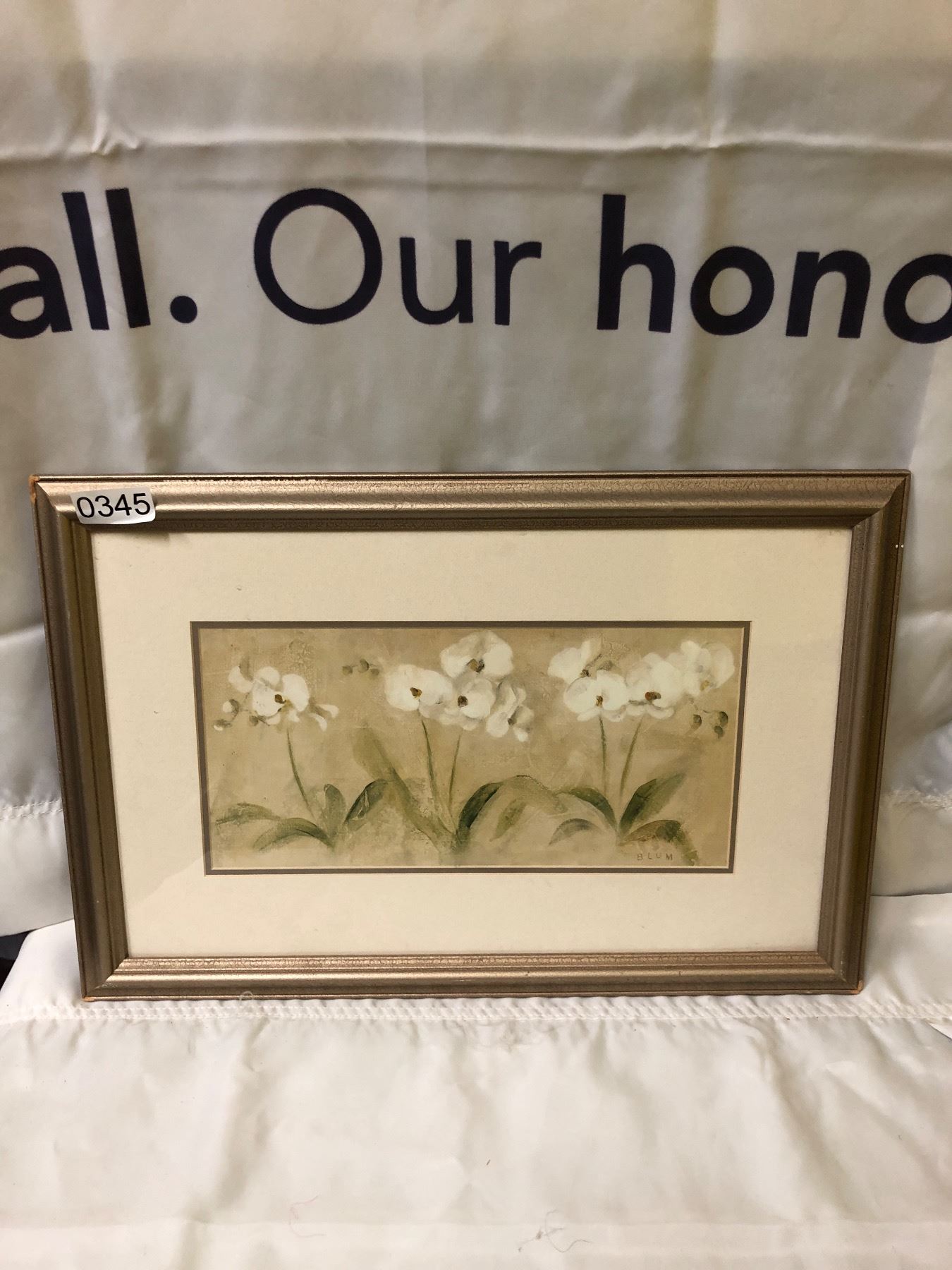 FRAMED FLORAL PAINTING / PRINT FROM ESTATE SIGNED BY ARTIST BLUMB APPROX 18IN X 12IN