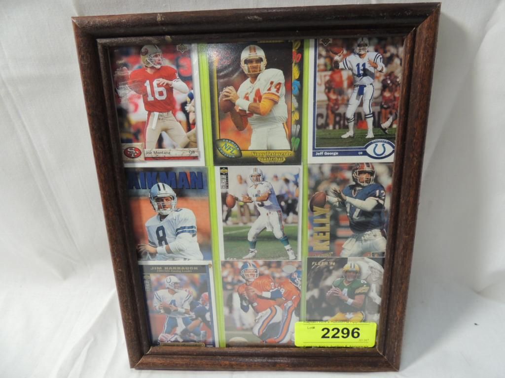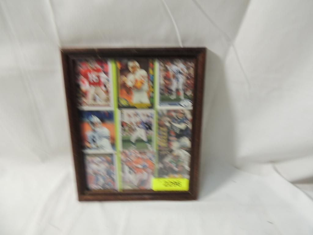 9 FOOTBALL PLAYER CARDS IN WOODEN FRAME. TRADING CARD. AS SHOWN SEE PHOTO FOR MORE DETAILS.