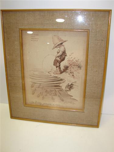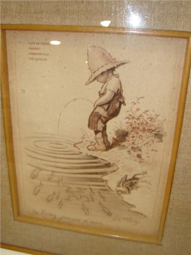 FRAMED FRENCH PRINT OF CHILD. Depicts a small child urinating into pond. 17.25” x 20” framed