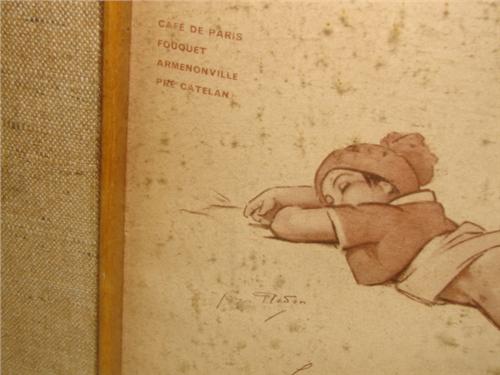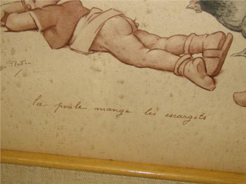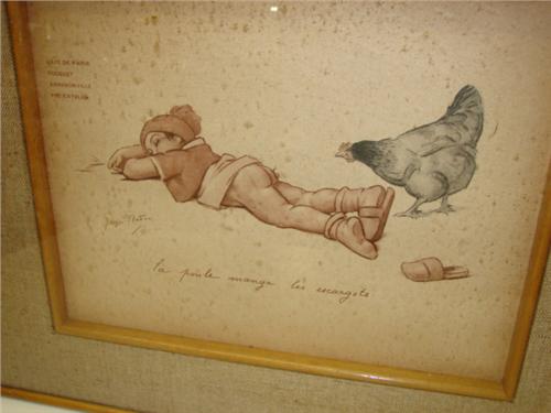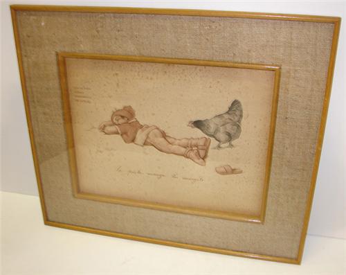 FRAMED FRENCH PRINT OF CHILD. Depicts a small child asleep on ground with chicken. 20.25” x 17” framed