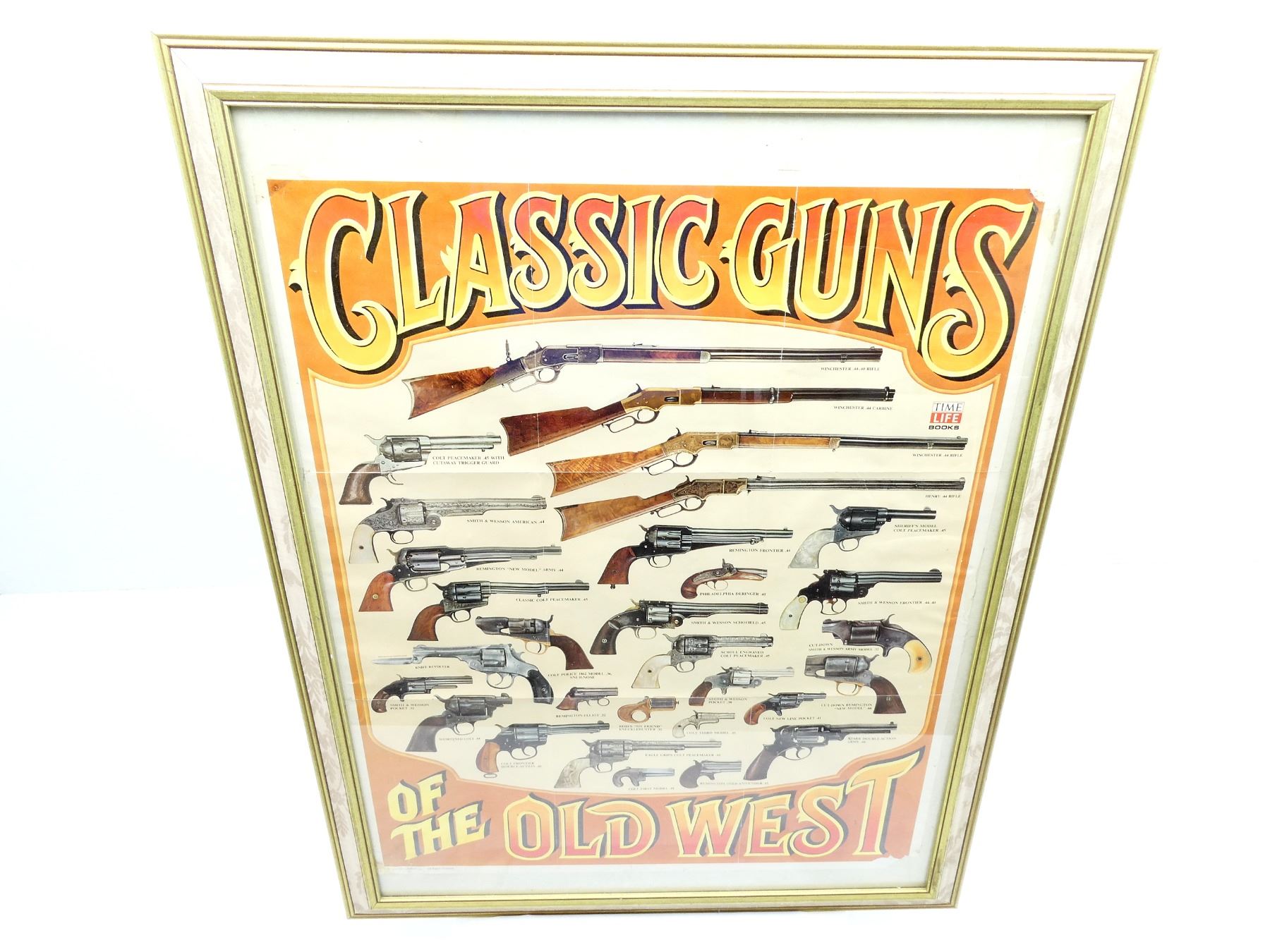 (1) FRAMED "CLASSIC GUNS OF THE OLD WEST" ADVERTISEMENT POSTER. SEE PHOTOS. *NO GUARANTEE ON GLASS FOR SHIPPING.
