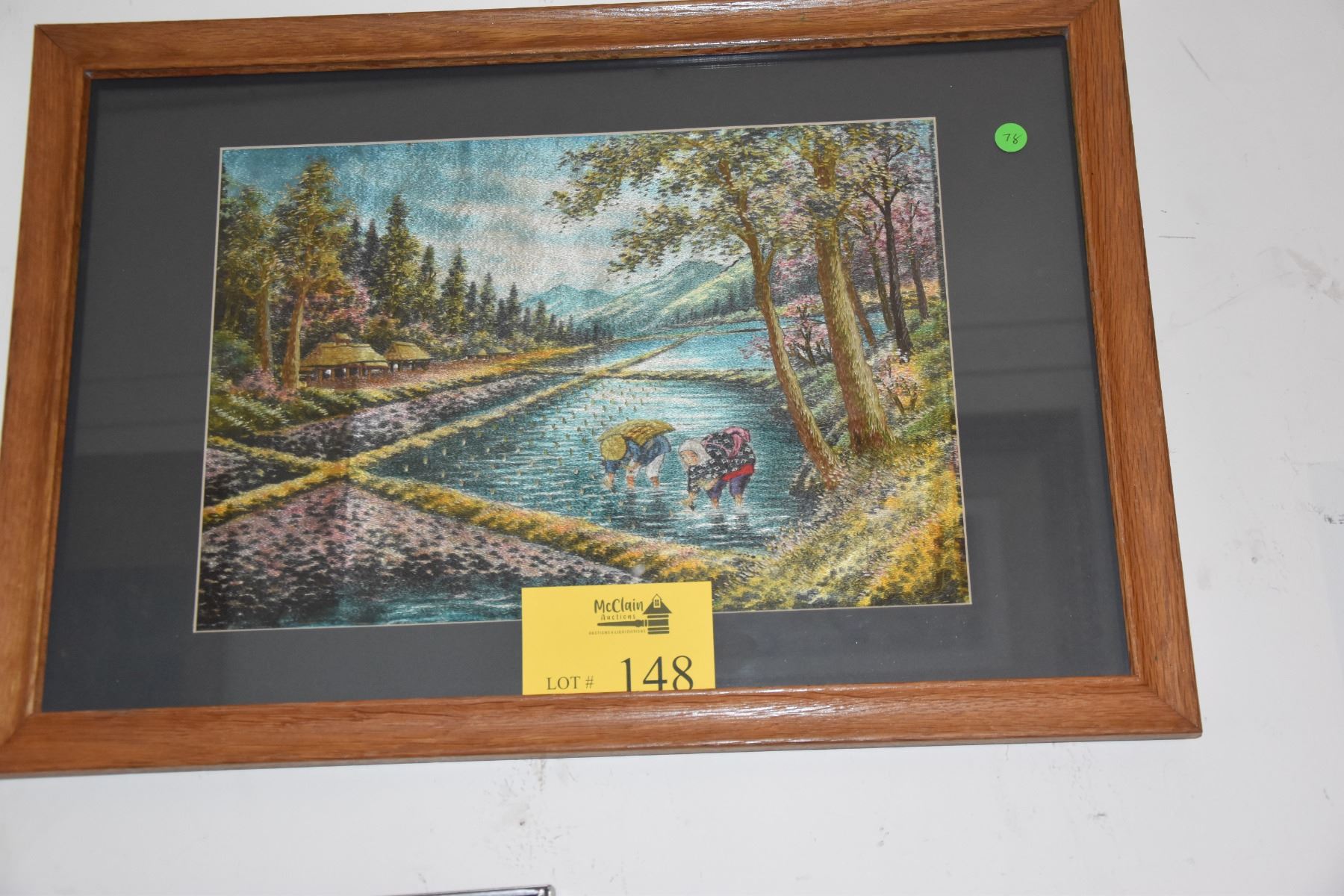 FRAMED HAND EMBROIDERED, "RICE PADDIES" SCENE (26" X 28")