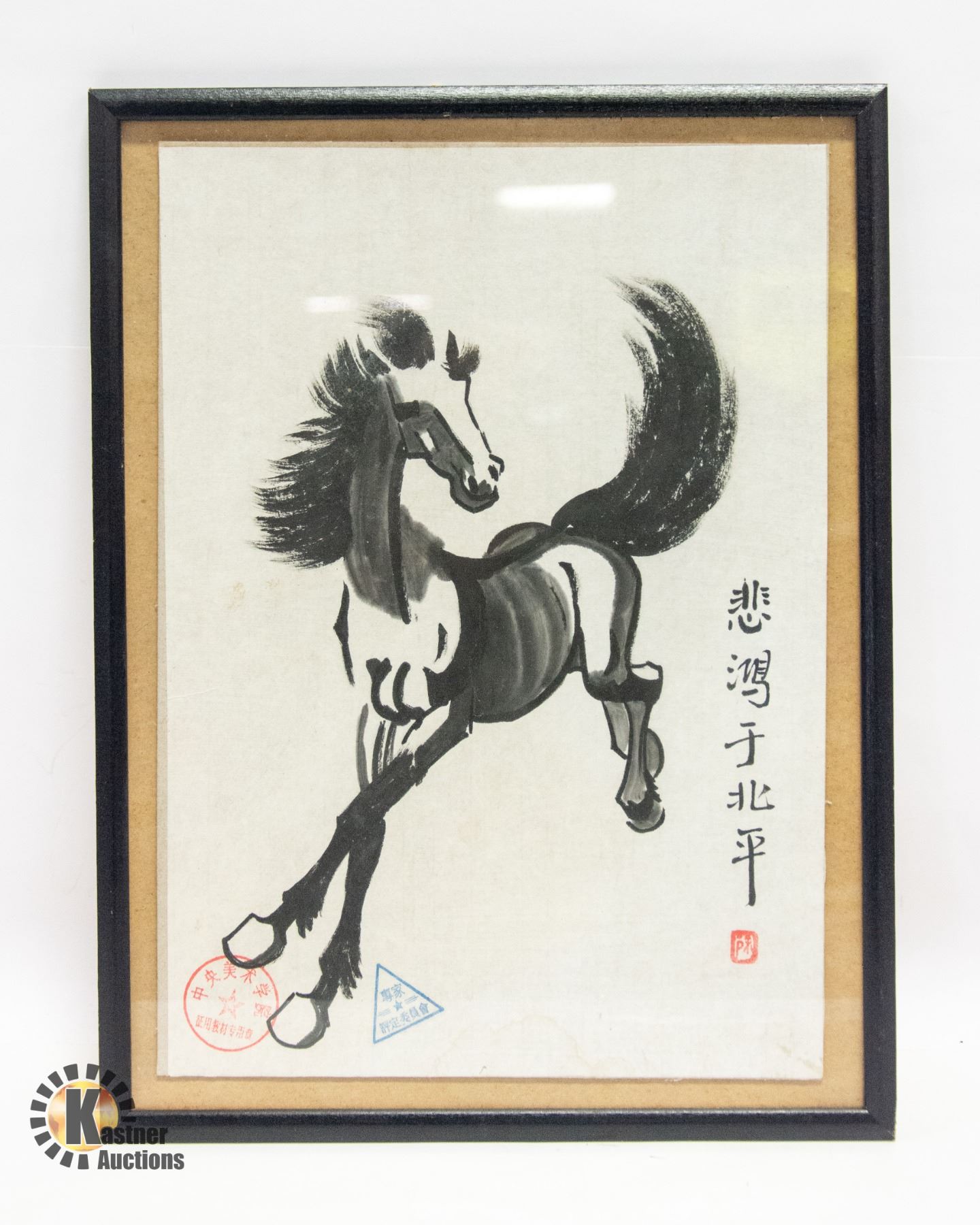 A FRAMED INK ON PAPER 'HORSE' PAINTING **ALL ITEMS MUST BE REMOVED BY 5PM SATURDAY, SEPTEMBER 30TH 2023. ALL REMAINING ITEMS WILL BE SUBJECT TO A $6.00 PER DAY STORAGE CHARGE. ANY ITEMS REMAINING AFTER MONDAY, OCTOBER 16TH, 2023 WILL BE CONSIDERED FORFEITED. NO REFUNDS WILL BE ISSUED FOR FORFEITED ITEMS. TO SCHEDULE A PICK UP APPOINTMENT CLICK HERE