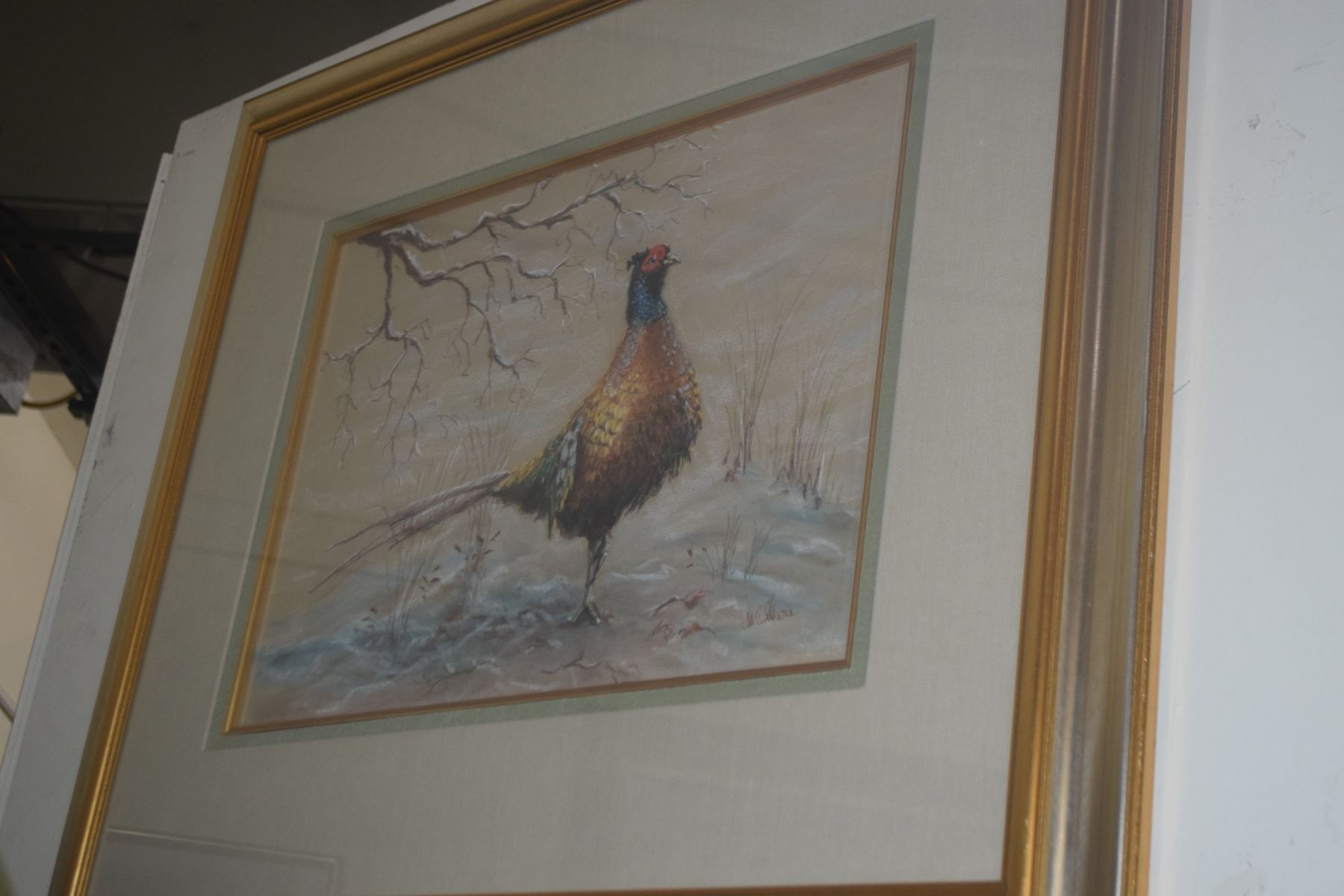 FRAMED IRISH PASTEL DRAWING ON PAPER, "PHEASANT", DEPICTING A COLORFUL PHEASANT STANDING BENEATH A BARE BRANCH; SIGNED H. OMAR (27 3/4" X 23 3/4")