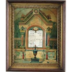 FRAMED JEWISH MEMORIAL. Colorful paper litho scene of what appears to be a tomb in a tropical setting. The tomb is inscribed in Hebrew and is flanked by two lighted menorahs, and two vignettes including one of a prayer wall. SIZE: 15 1/2" w. x 18 1/2" h. CONDITION: Some light roll creases. Bright colors throughout with some touch up to lettering. 1-4456 (50-75)
