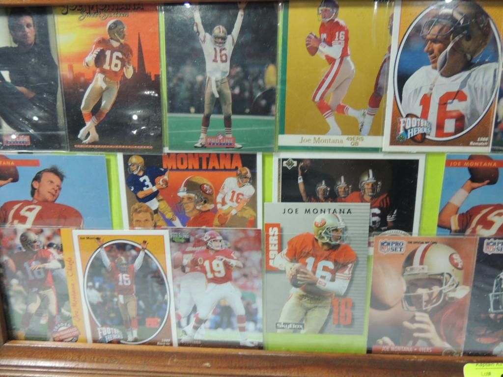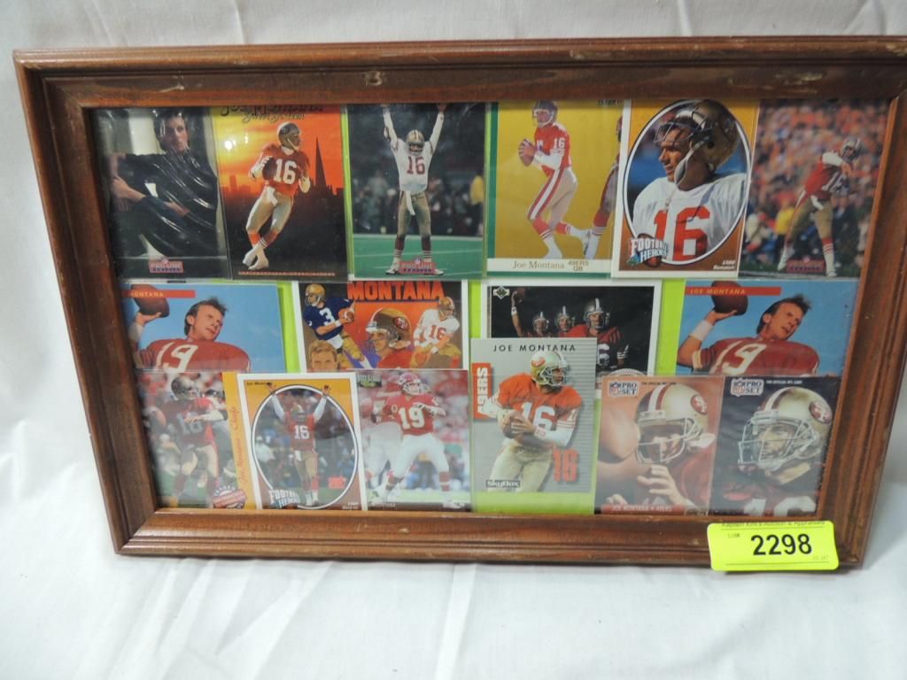 16 FOOTBALL PLAYER CARDS IN WOODEN FRAME. COLLAGE TRADING CARDS. AS SHOWN. SEE PHOTO FOR MORE DETAILS.