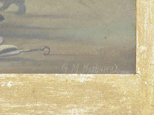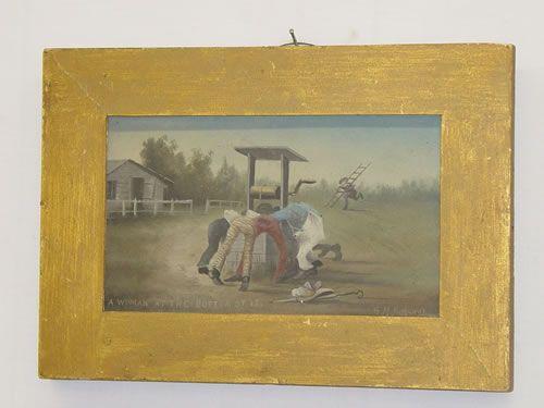 FRAMED LATE 19TH CENT. OIL ON ARTIST BOARD COMEDY W/ BLACK MEN LOOK DOWN WELL TITLED "A WOMAN AT THE BOTTOM OF IT" SIGNED G.M. HATHAWAY ON LOWER RIGHT (5 3/4" X 10") - MINOR IMPERFECTIONS & PAINT LOSS
