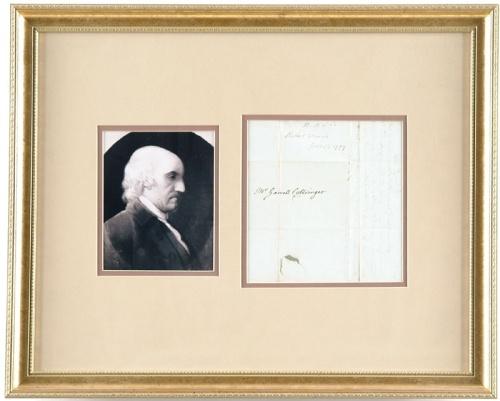 FRAMED LETTER SIGNED BOB MORRIS, 1799. The brief letter dated January 4 1799 to a Mr. Garrett Cottringer. It is housed in a replacement gilt frame with double matte; along side a picture of Robert Morris. Back side with cutout for letter and back glass. Robert Morris (1734-1806) was one of the signers of the Declaration of Independence. SIGHT SIZE: Letter is 7-1/2in. x 7in.. Overall is 18in. x 22in.. CONDITION: There is a 3/4in. x 1/4in. hole and related tears. Otherwise good. 9-26170