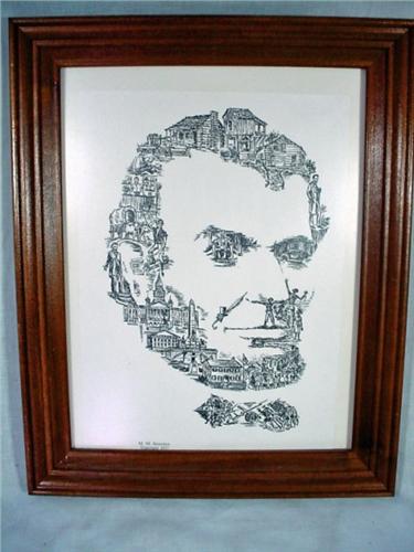 FRAMED LIFE STORY OF ABRAHAM LINCOLN M.M. SWANSTON, WITH PEN AND INK DEPICTIONS OF HIS LIFE DRAWN TO CREATE THE FACE 15"X12".