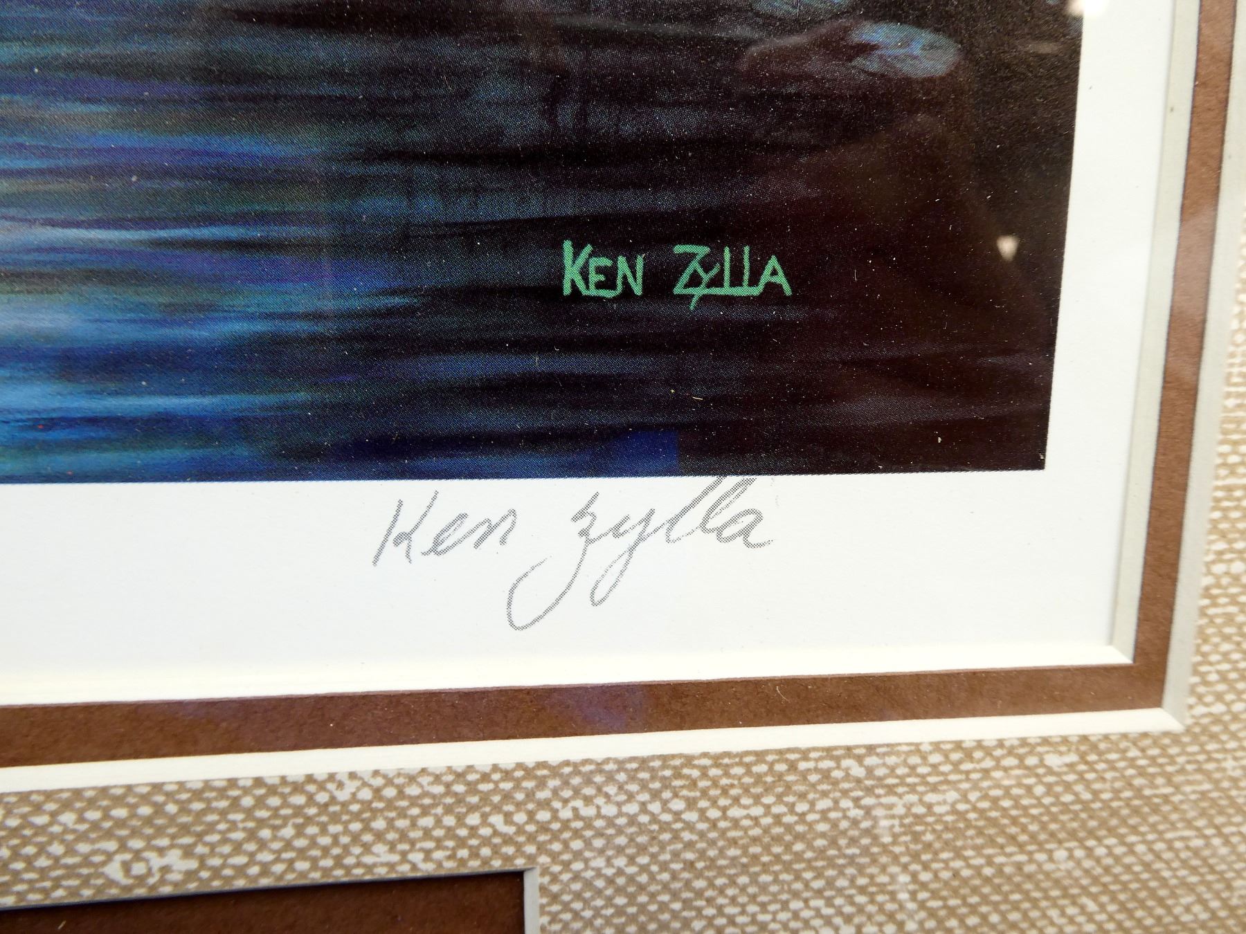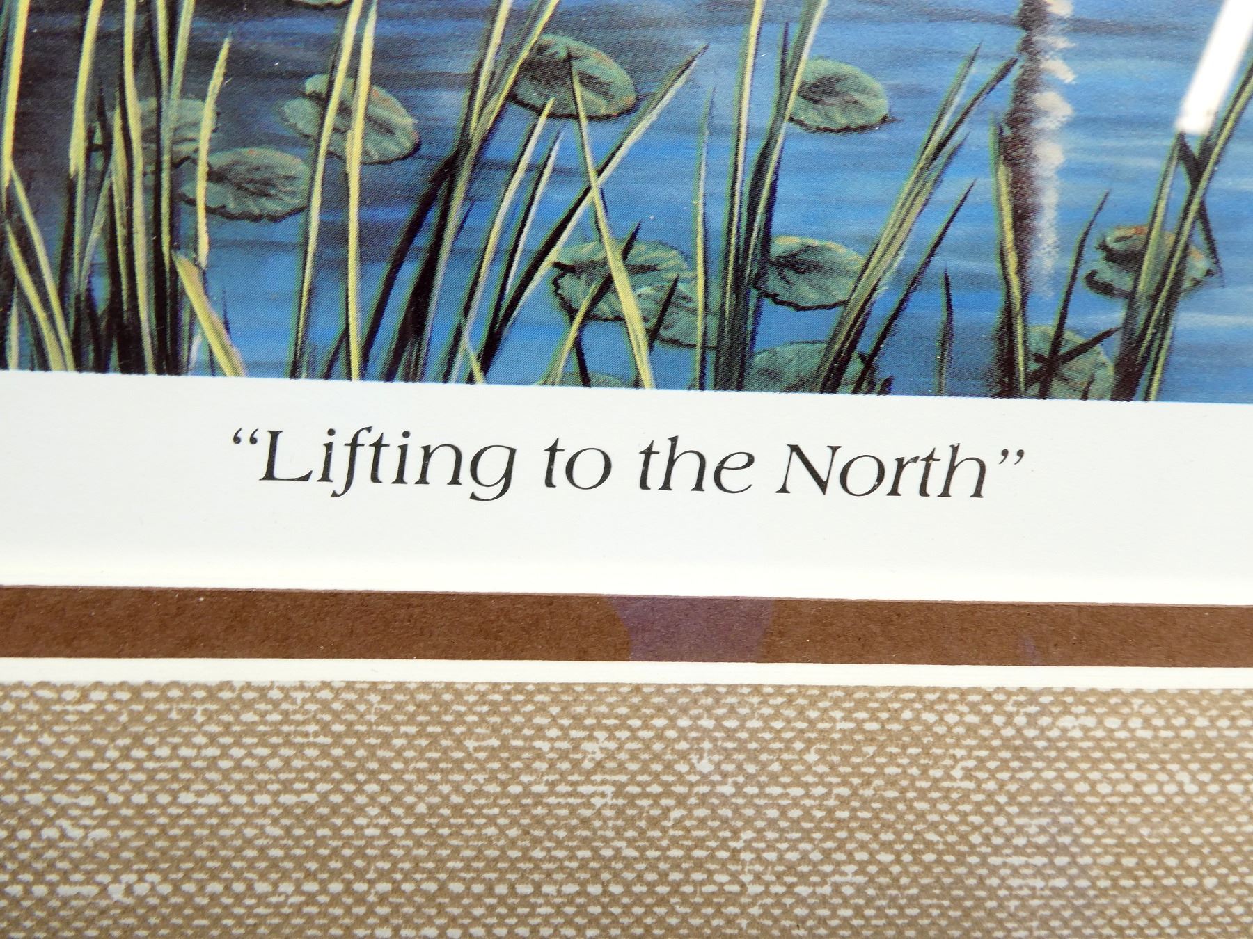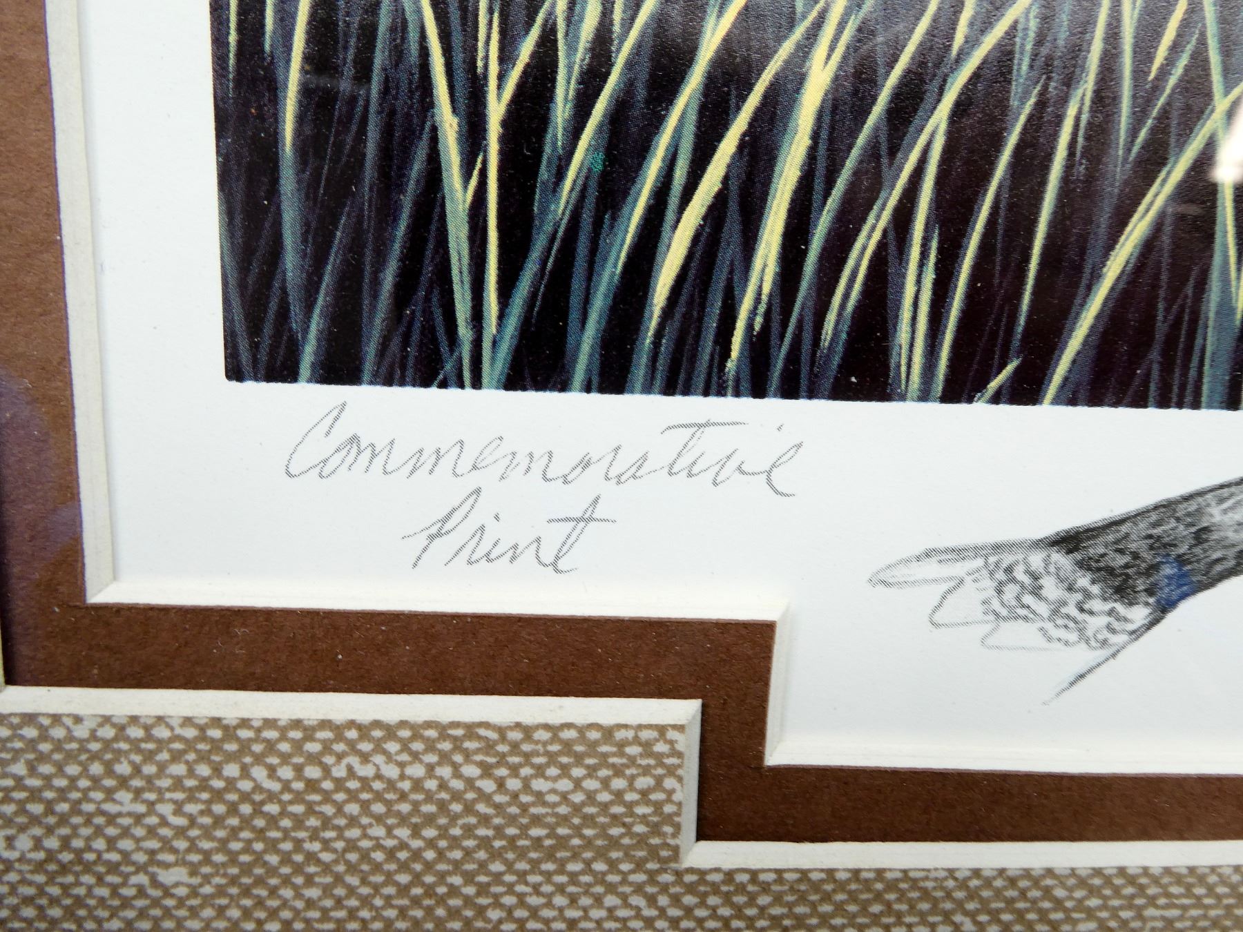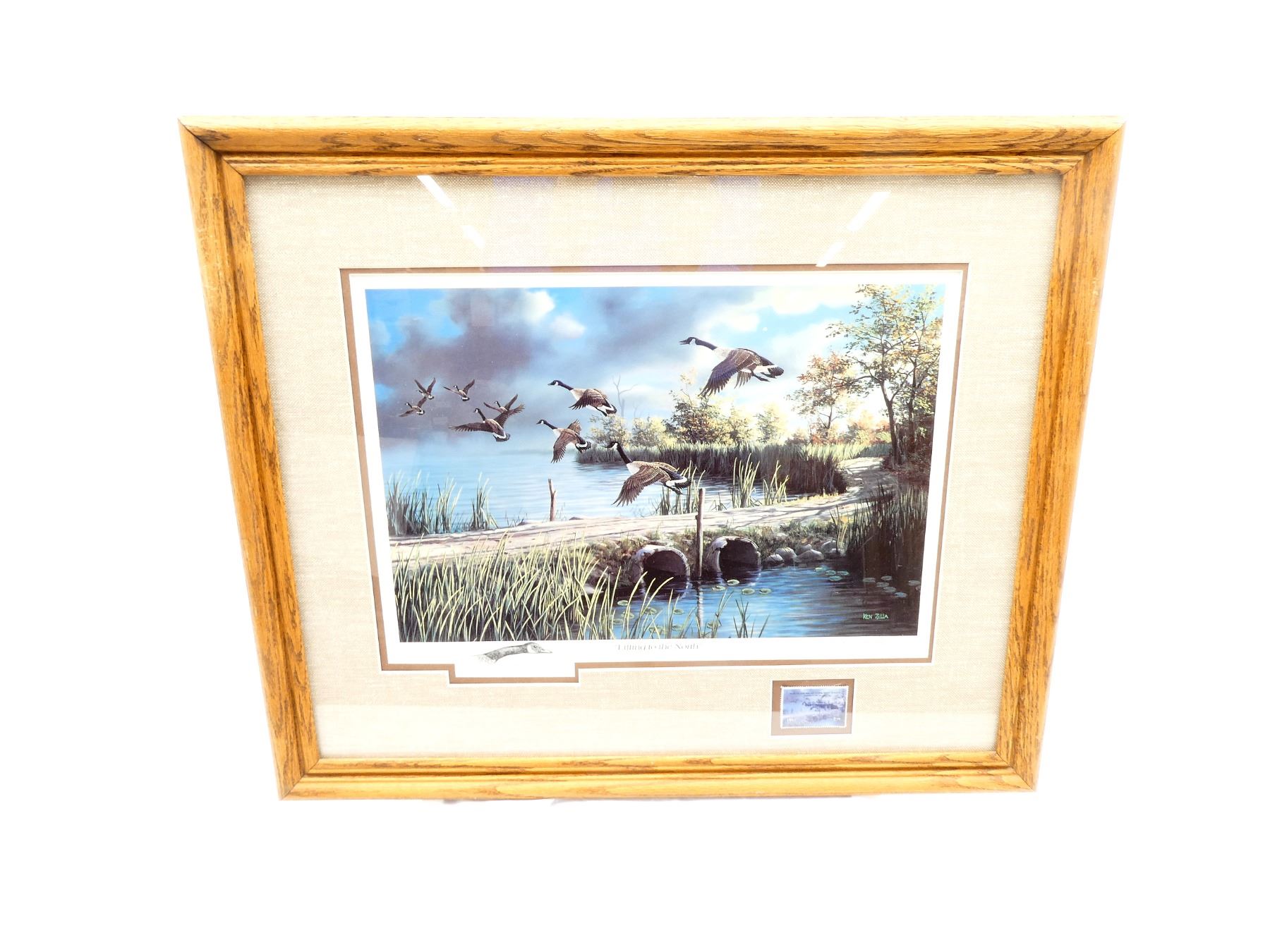 (1) BY KEN ZYLLA, WITH NORTH AMERICAN GAME BIRD SERIES STAMP, DATED 1987, WOOD FRAME, UNDER GLASS, APPROX. 24.25" X 20.5" X 1". SEE PHOTOS. *NO GUARANTEE ON GLASS FOR SHIPPING*