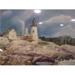 FRAMED LIGHTHOUSE PAINTING. Watercolor. Depicts lighthouse on edge of cliff. Signed in lower right “Witt Dietriel-53”. 27” x 21” framed.