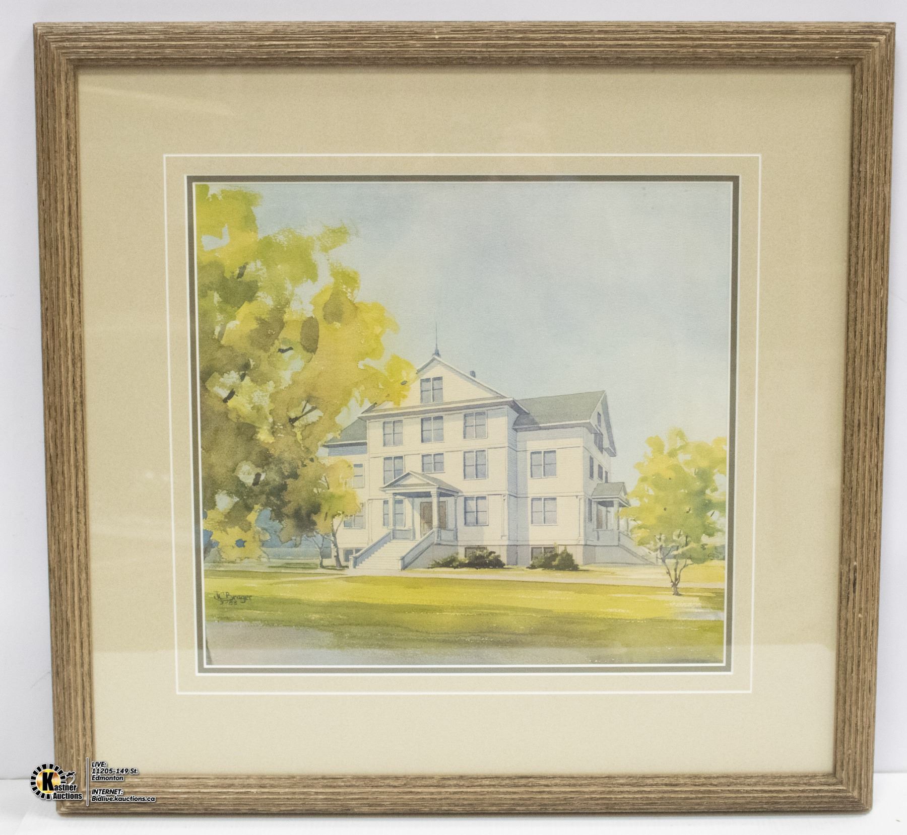 FRAMED PRINT BY J.C. BRAGER, ALBERTA. OLDER SCHOOL OR COLLEGE BUILDING. , . SIGNED. #3/83. 19" X 20"