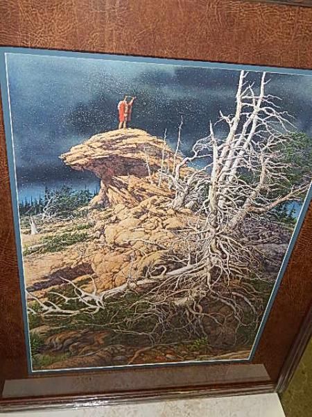 FRAMED LIMITED EDITION PRINT " PRAYING FOR THE WILD THINGS - BEV DOOLITTLE - UNFRAMED PRINT VALUE $625 - ACCENTED WITH FAUX LEATHER MATTING AND ETCHED FRAME - APPROX. GALLERY VALUE $1500