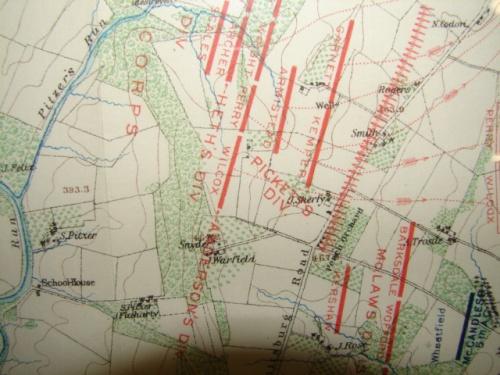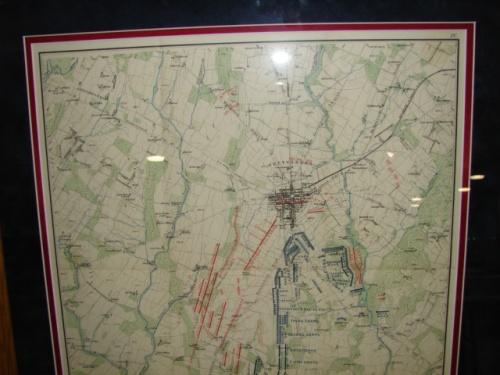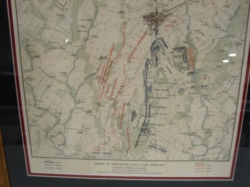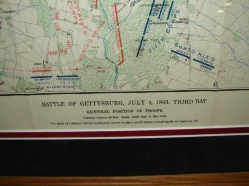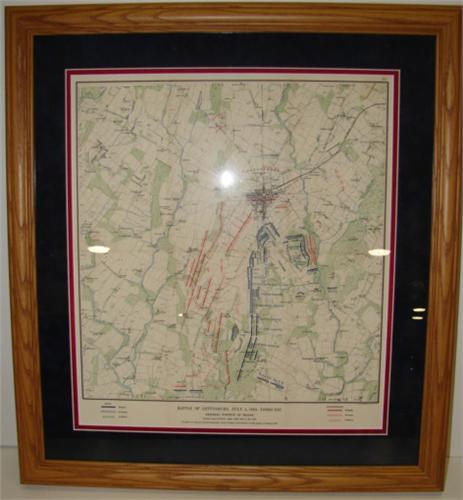 FRAMED MAP OF THE BATTLE OF GETTYSBURG. July 3, 1863. Map is from the original book New York at Gettysburg, July 1, 2, & 3, Vol. 11. J.B. Lyon Company, 1900. Map is beautifully framed and matted. 20.75" x 22.75" framed.