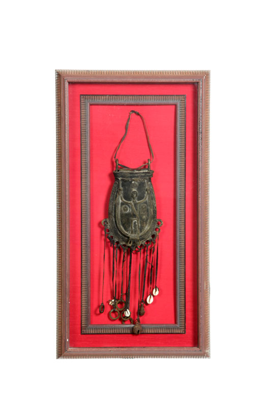 Probably Africa, late 19th-early 20th century, brass. Cast bag and lid with figural decoration. Leather ties and fringe with cowrie shells. 22"h. Frame, 22"h. 17"w.