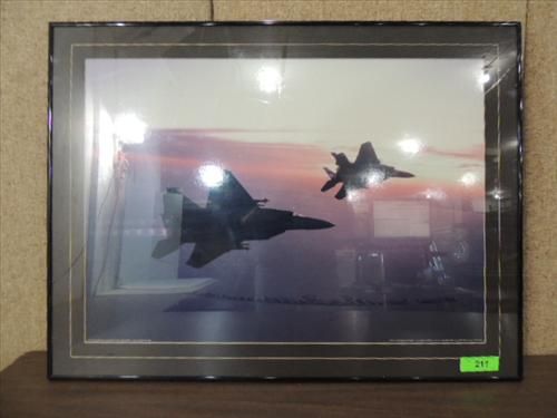 FRAMED MATTED MILITARY POSTER ART: F-15 EAGLE FIGHTER JETS AT SUN SET. (33X25). AS SHOWN. VIEW PICTURE FOR DETAIL.