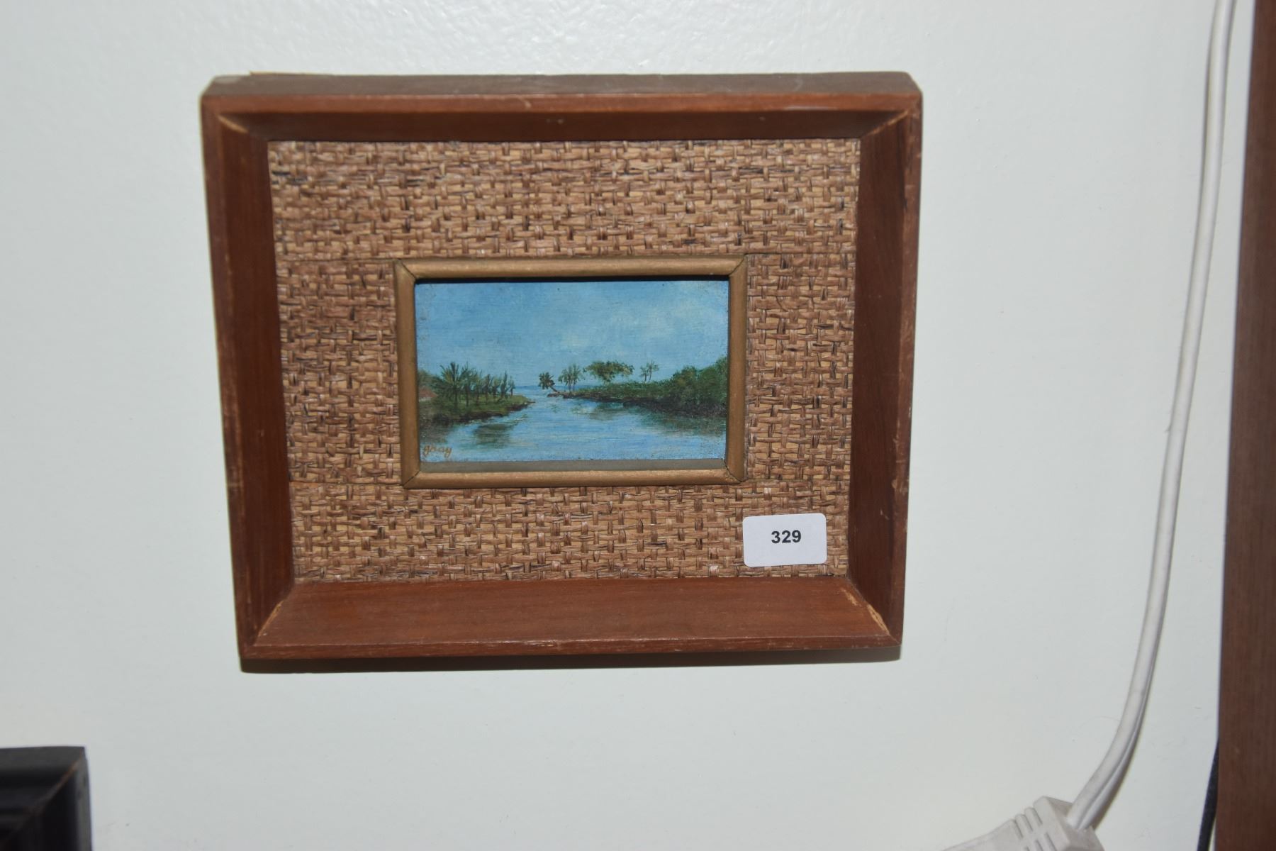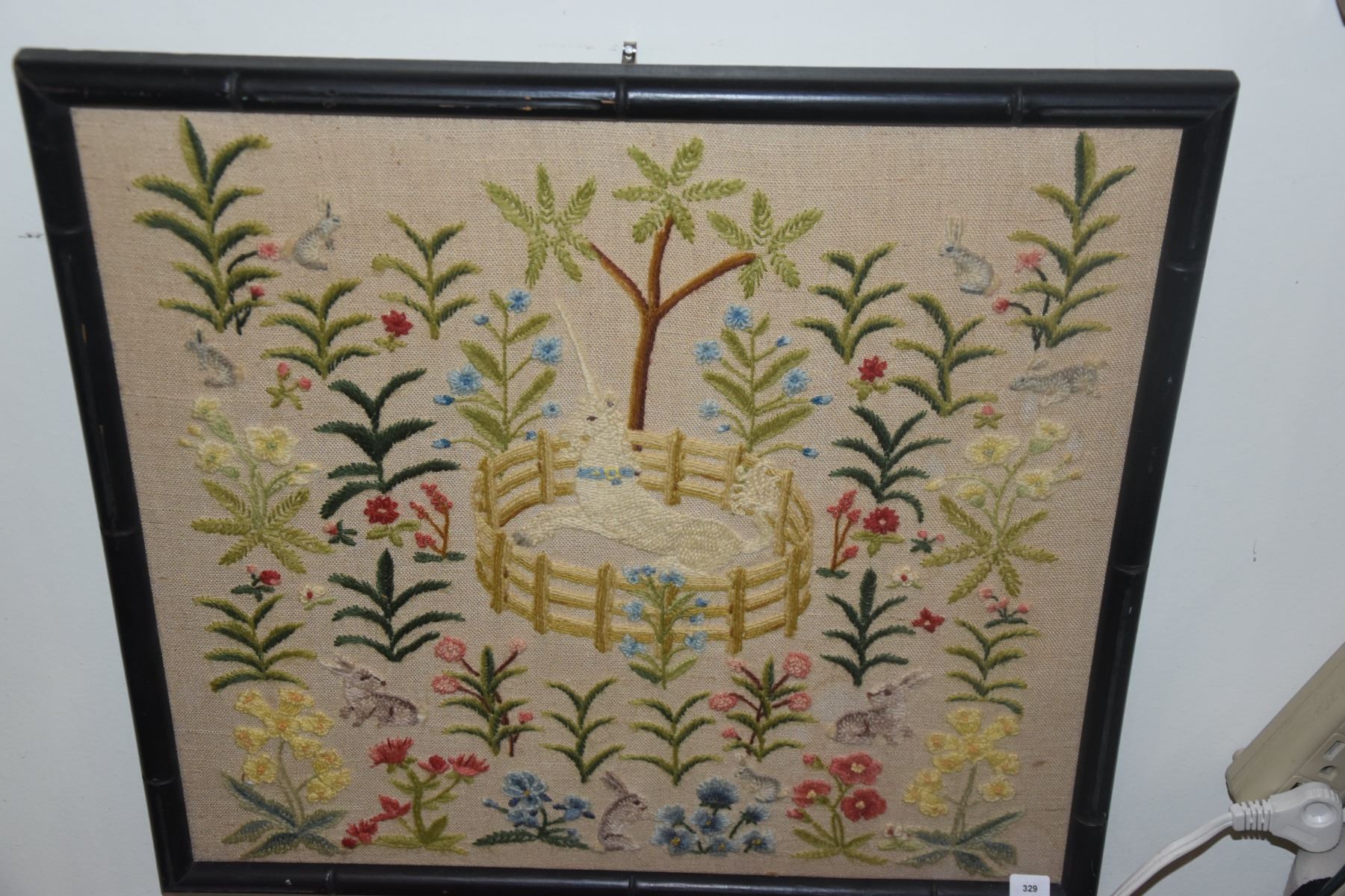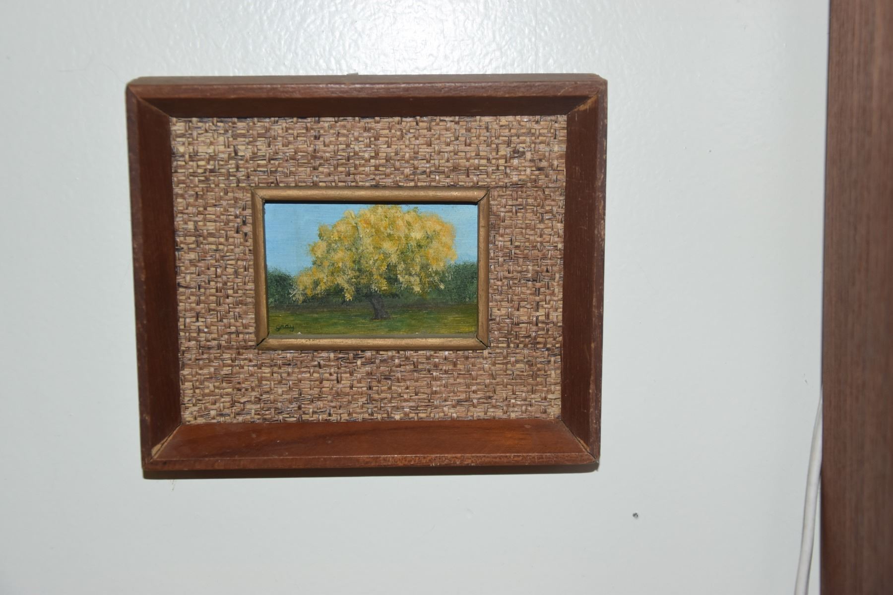 FRAMED MINIATURE OIL PAINTINGS ON BOARD; SIGNED GRAY & FRAMED UNICORN EMBROIDERY (3 PCS)