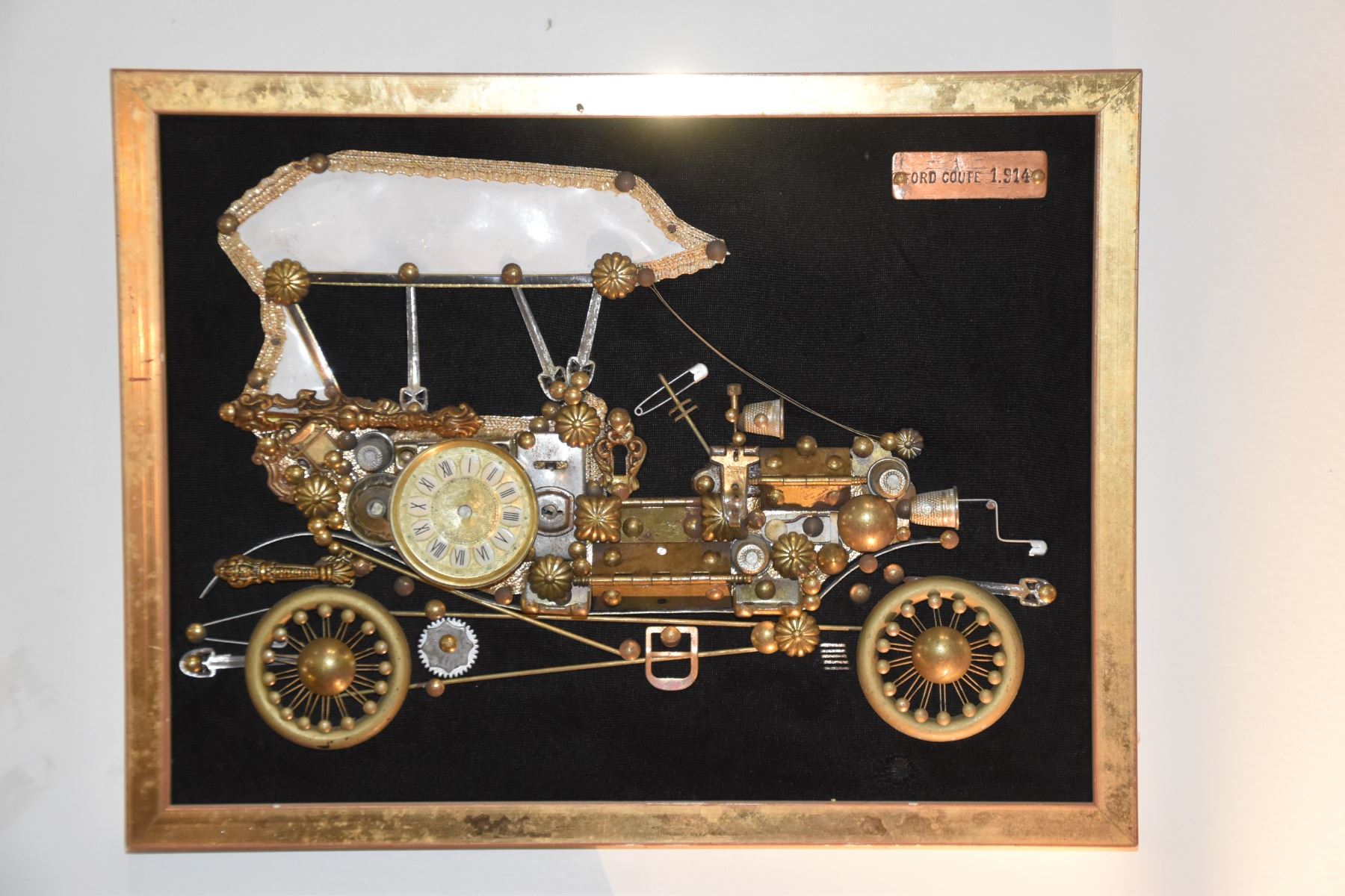 FRAMED MIXED MIDIA, TRAMP ART CAR