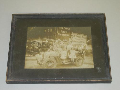 FRAMED MOUNTED PHOTO OF A DECORATED PARADE CAR W/ ADULT & CHILD RIDERS ADVERTISING COLEMAN BROS.- BOSTON'S BUSY CONTRACTORS (4 3/4" X 6 1/2")