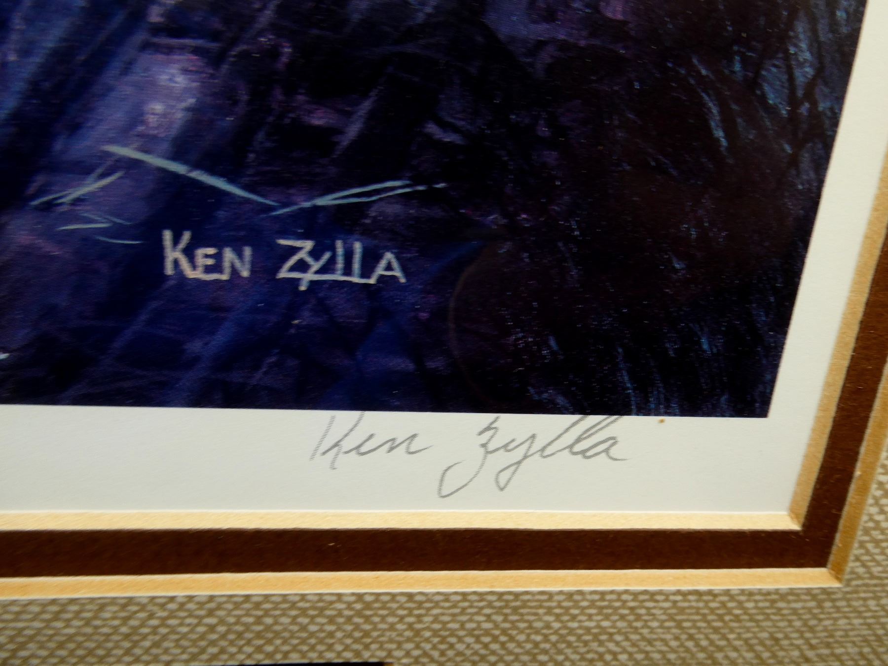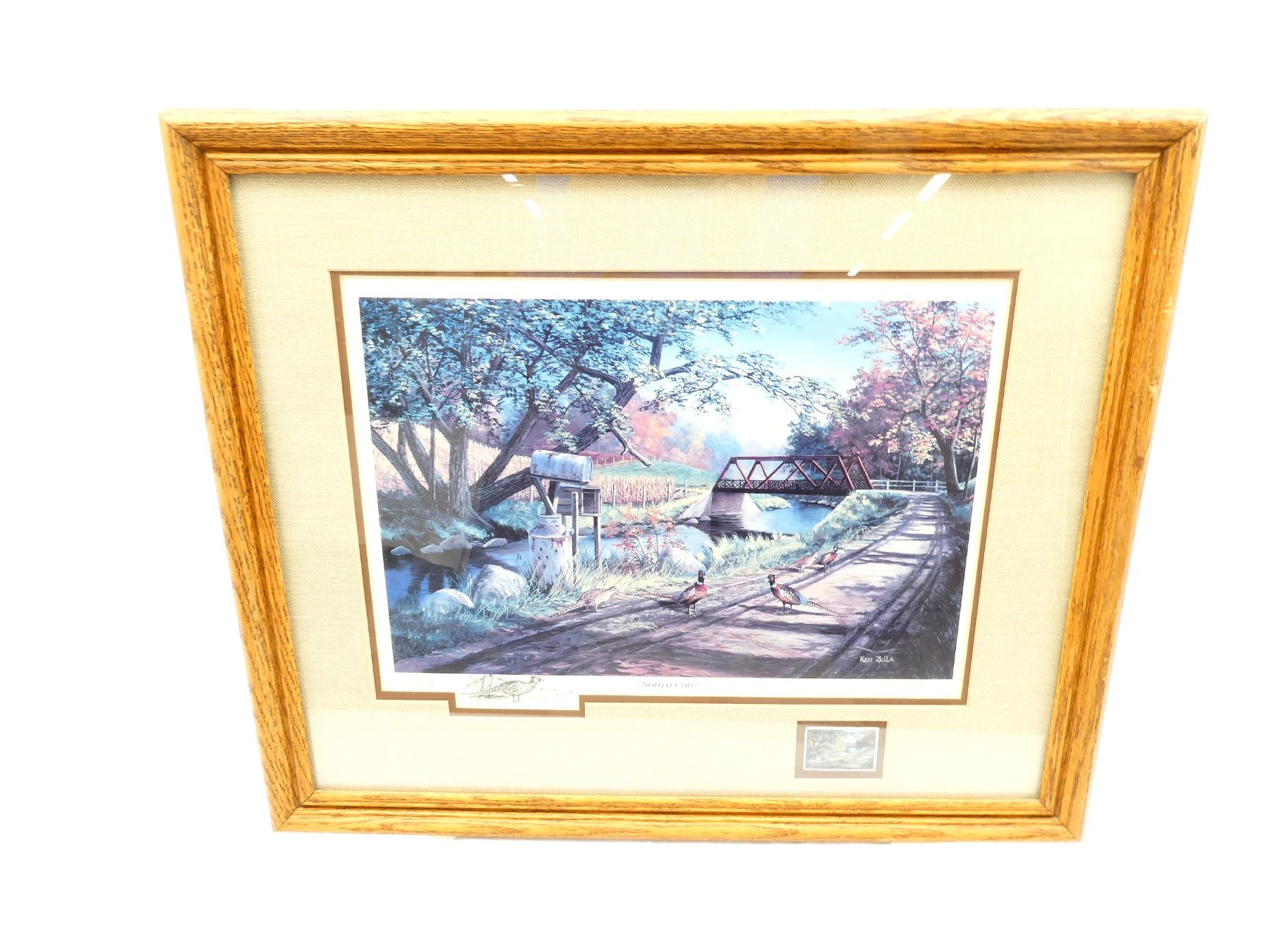 (1) BY KEN ZYLLA, WITH NORTH AMERICAN GAME BIRD SERIES STAMP, DATED 1986, WOOD FRAME, UNDER GLASS, APPROX. 24.25" X 20.5" X 1". SEE PHOTOS. *NO GUARANTEE ON GLASS FOR SHIPPING*