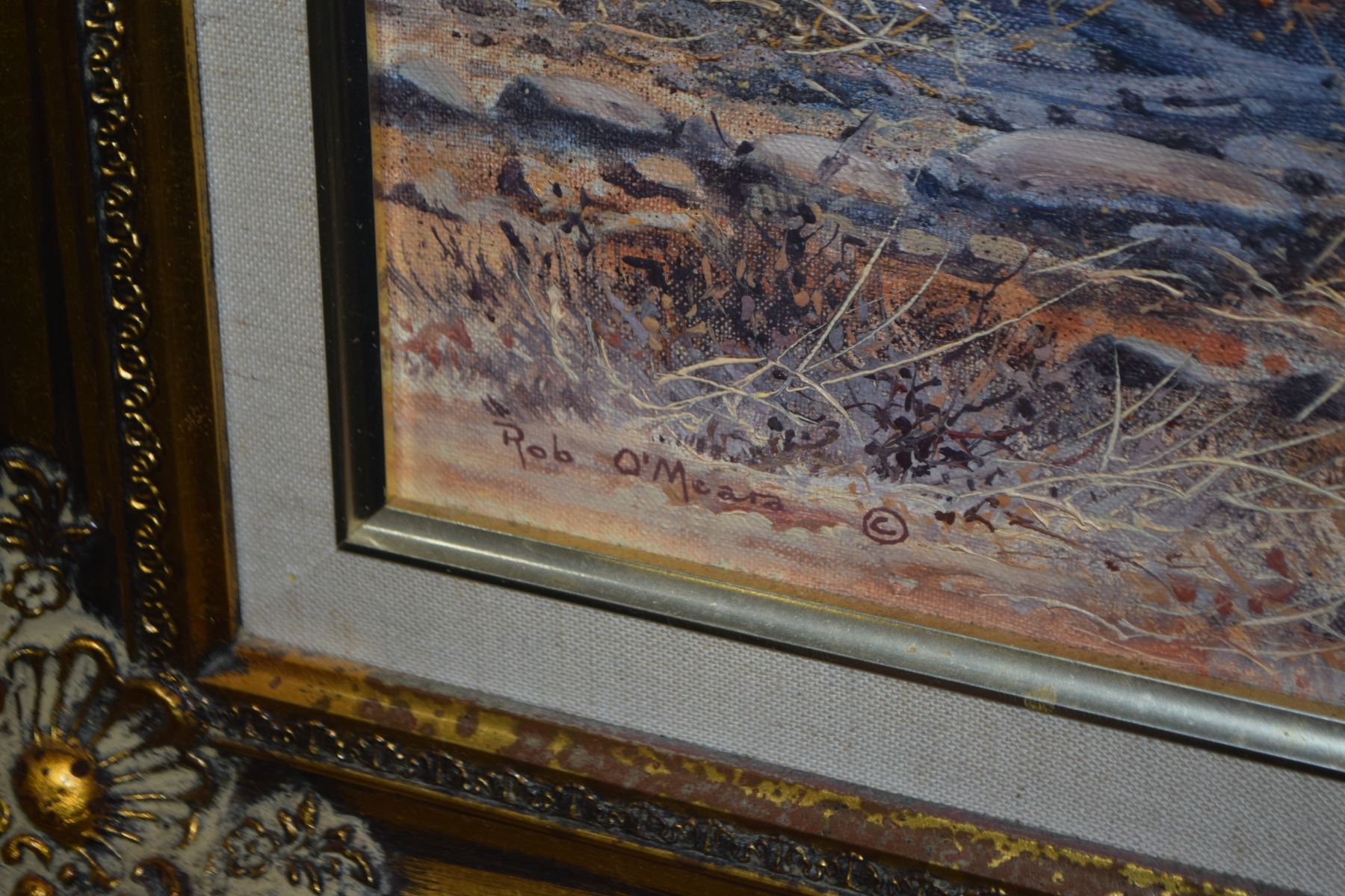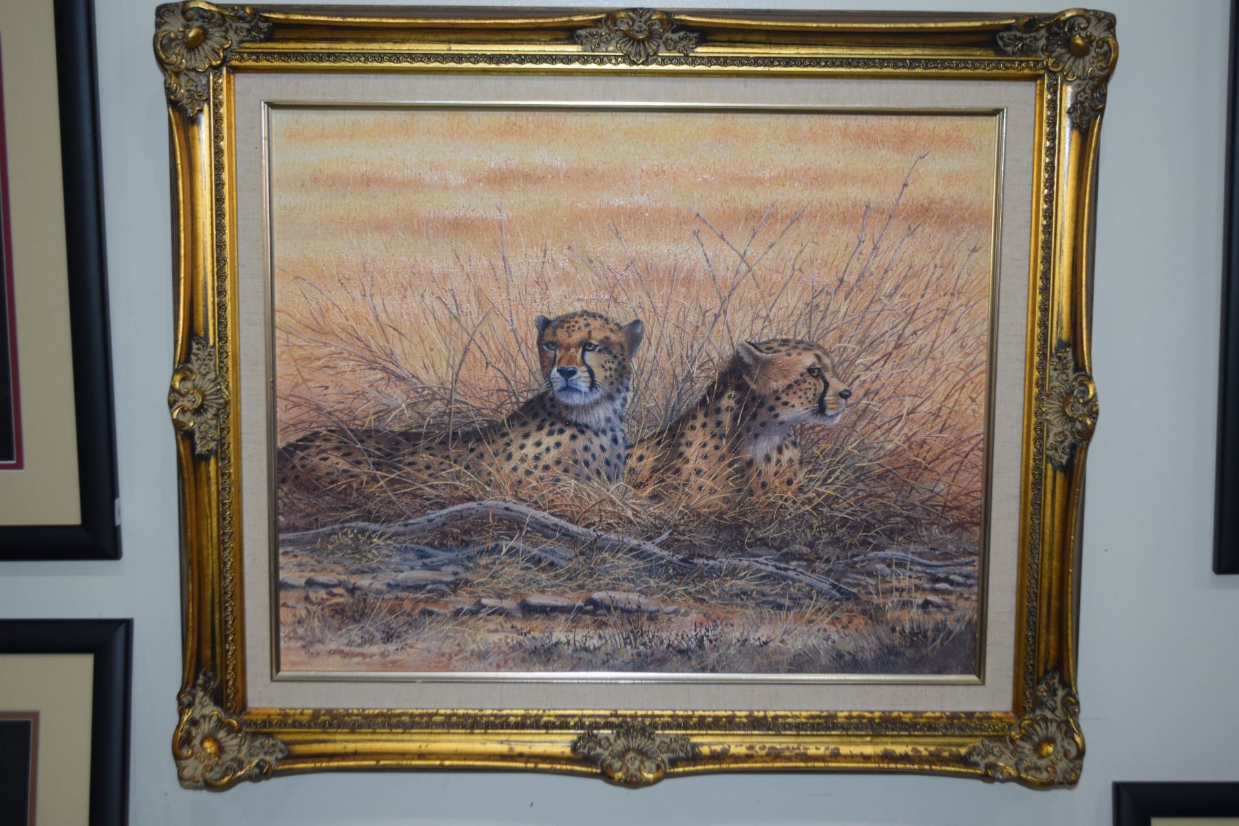 FRAMED OIL ON CANVAS, "CHEETAHS", DEPICTING 2 CHEETAHS RESTING IN A GRASS THICKET; SIGNED ROB O'MEARA (25" X 21")