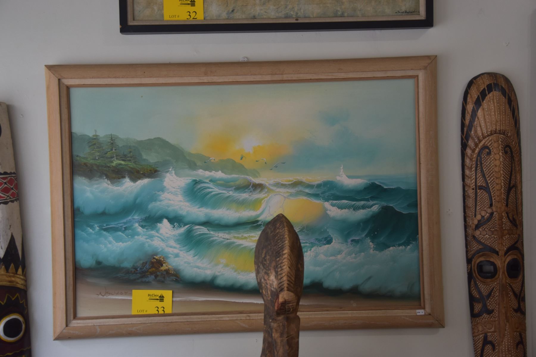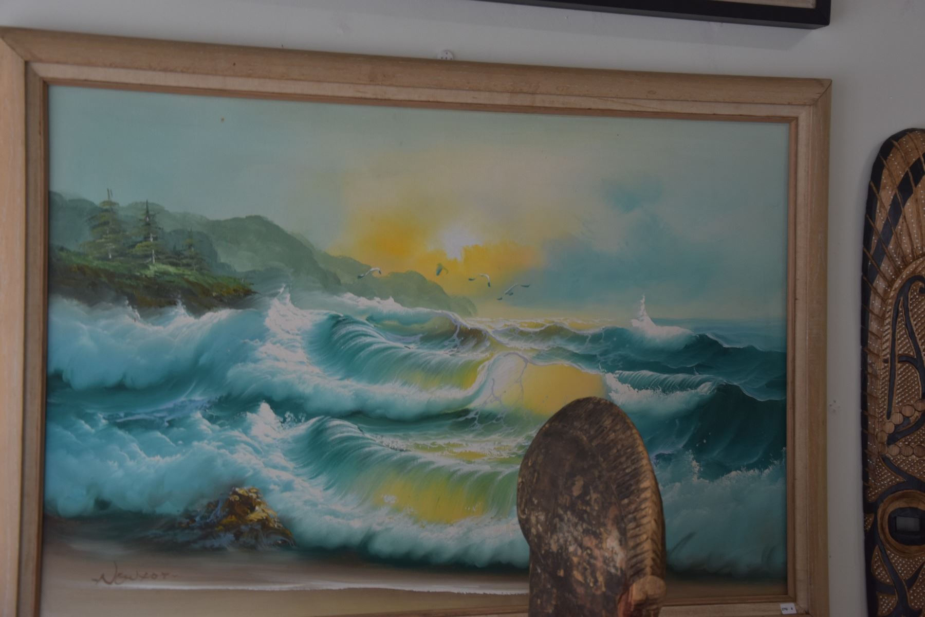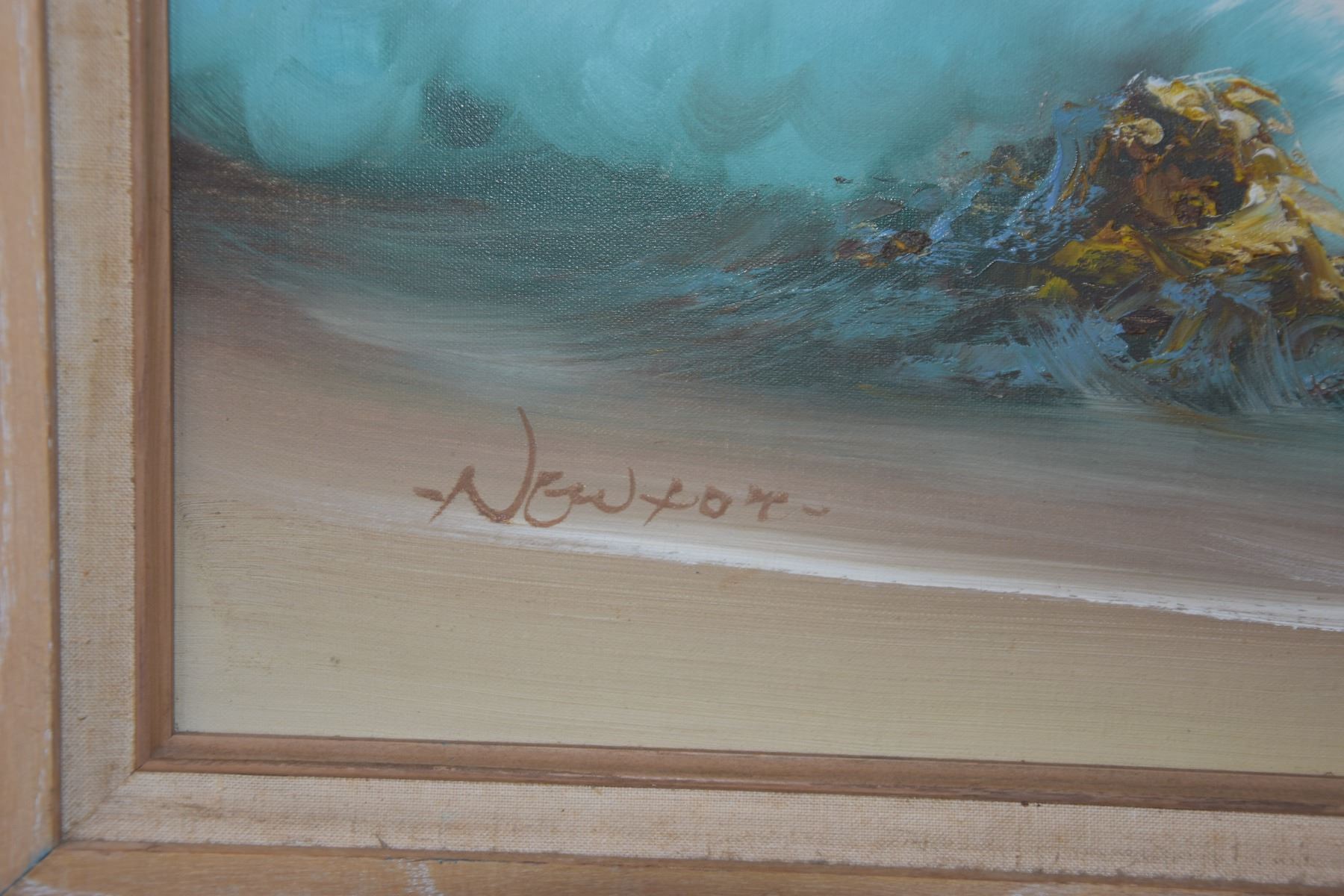 FRAMED OIL ON CANVAS, "SUNSET LIGHT ON WAVES"; NEWTON (40" X 28 1/4")
