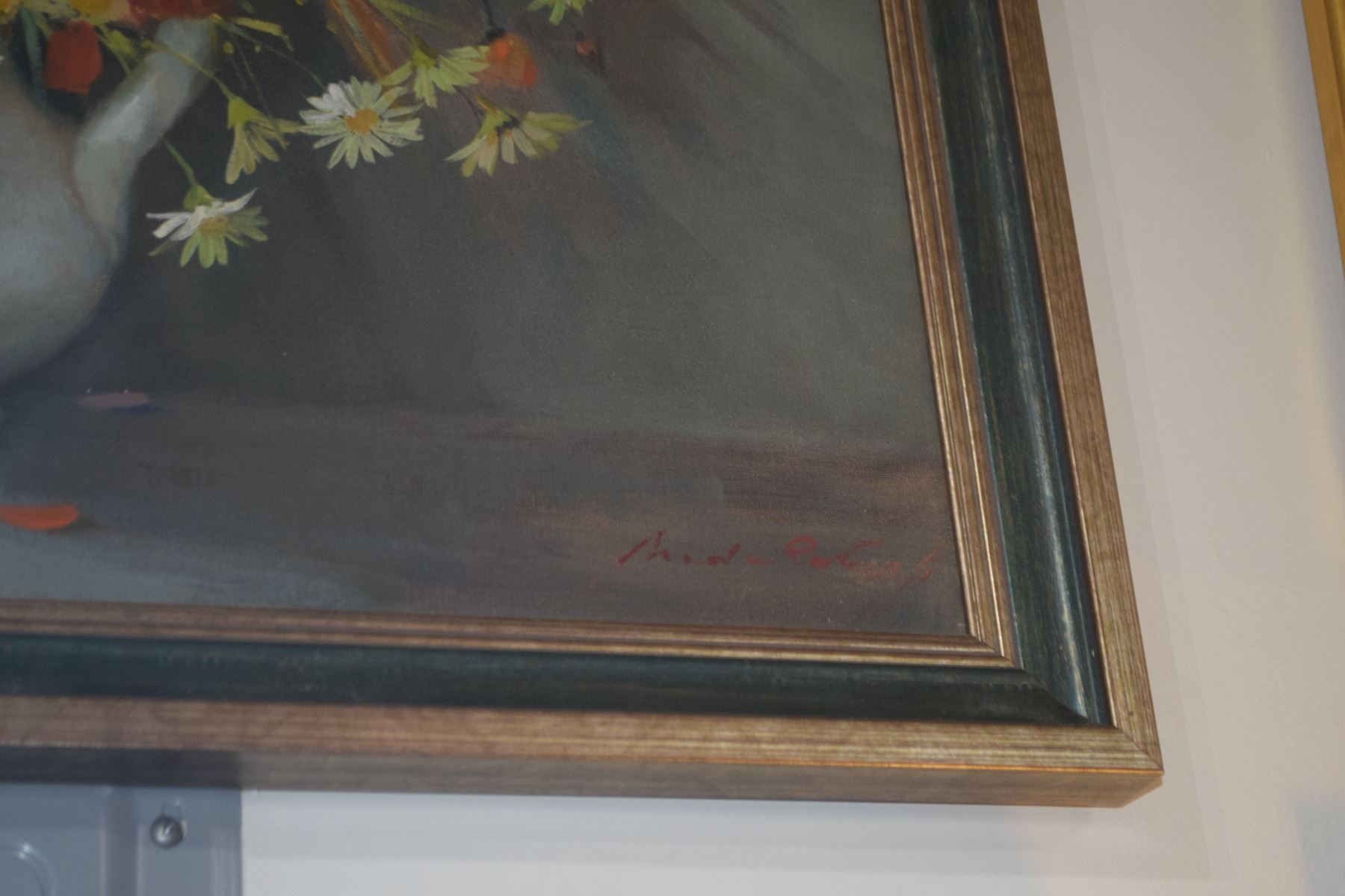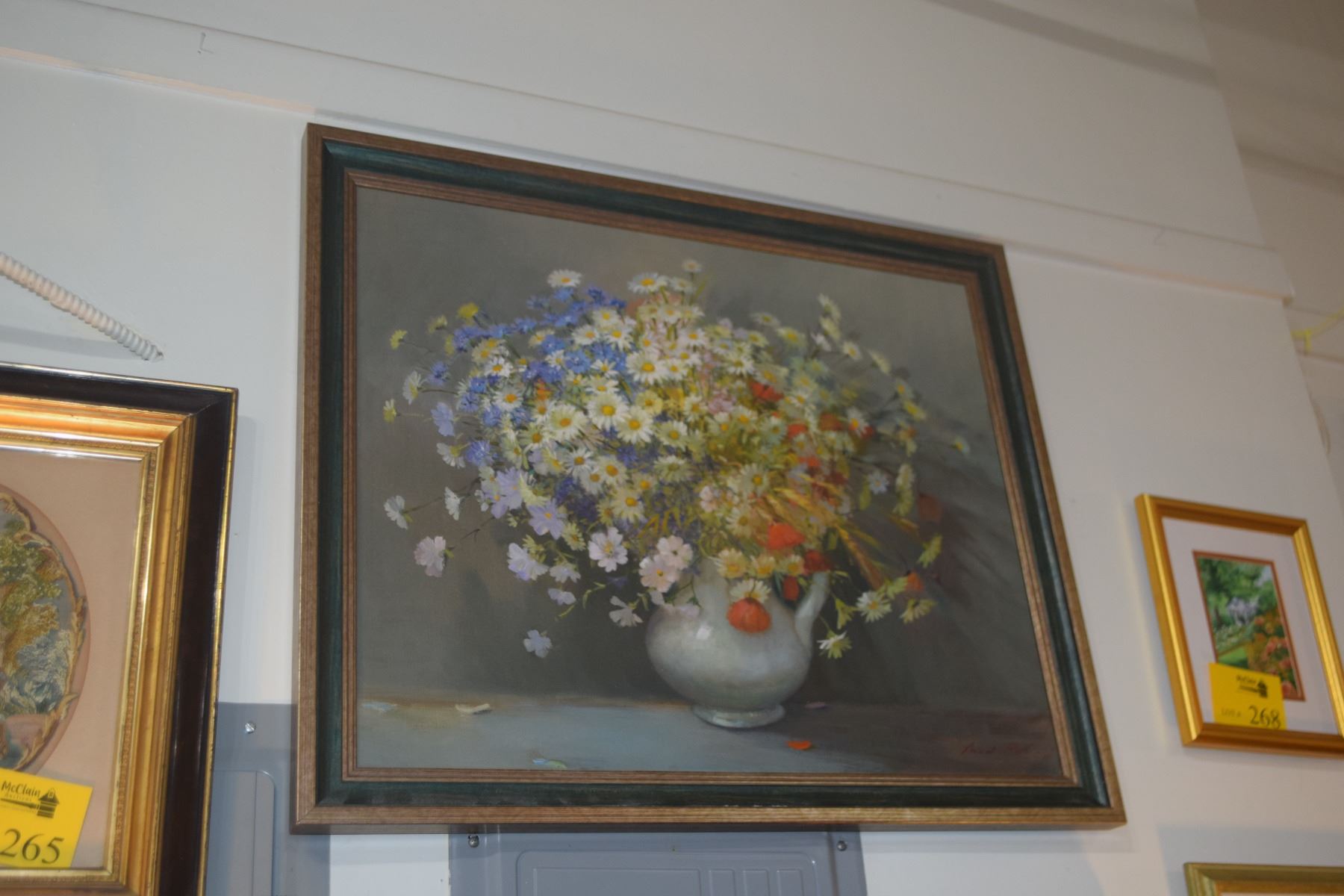 FRAMED OIL ON PANEL, STILL LIFE, DEPICTING A COLORFUL SPRAY OF FLOWERS IN A CRACKED POT; SIGNED (32" X 27")