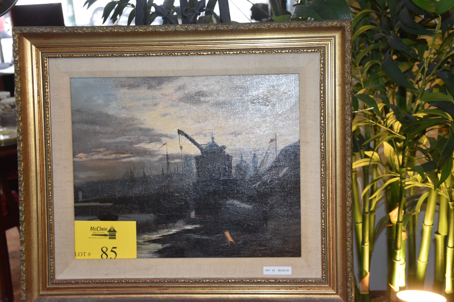 FRAMED OIL PAINTING ON CANVAS BOARD , DOCK AREA OF LONDON FROM THE THAMES RIVER (PURPORTED TO BE LIONEL WALDEN) (20 1/2" X 17 1/2")
