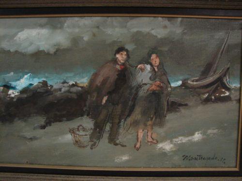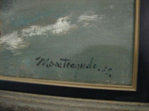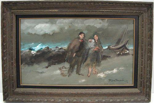 FRAMED MONTEAGUDE OIL PAINTING. ‘People on Beach’. Oil on canvas. Depicts a man and woman standing on a beach with a boat in the background. Signed in lower right “Monteagude 69”. Gault Galleries label on verso is marked “Monteagude/People on Beach”. 16.25” x 9.5”