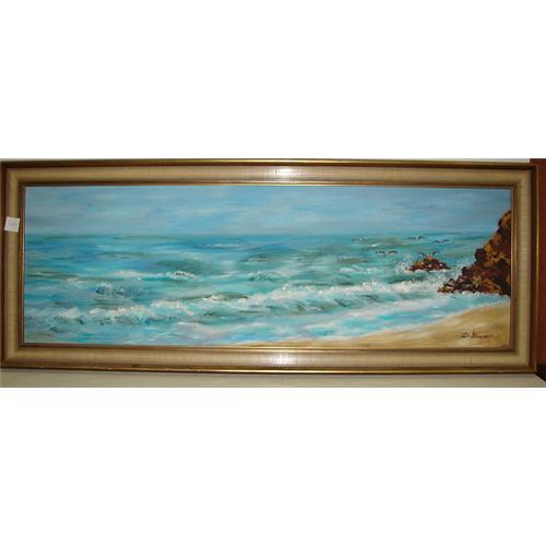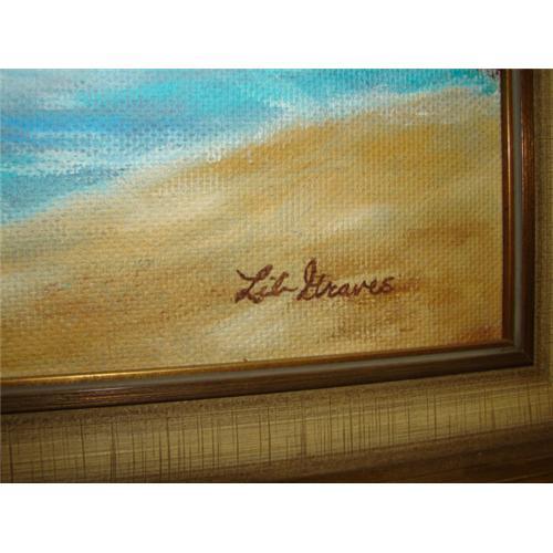 FRAMED OIL PAINTING. Oil on board. Depicts a landscape shoreline scene with waves crashing on rocks with seagulls. Signed in lower right “Lib Graves”. Has attached Lib Graves business card on verso with handwritten text that reads “Happy 80th Birthday/Oct. 24, 1977/Much Love/Lib & Bill”. Not examined out of frame. 12” x 36”