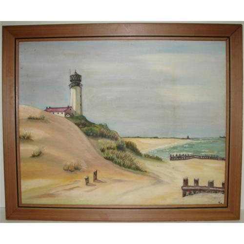 FRAMED LIGHTHOUSE OIL PAINTING. Oil on board. Depicts a lighthouse along a shoreline. Signed in lower right “GGC”. Marked on verso “Xmas 1959/From Claire to Martin Graves”. Not examined out of frame. 16” x 20”