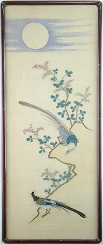 FRAMED ORIENTAL NEEDLEWORK PICTURE. Picture shows two exotic birds on flowering branches under a full moon. Unsigned. Nicely housed in an oriental style wood frame which has a label on the back ""Foster Brothers Boston"". SIGHT SIZE: 55-1/2in. x 22in.. CONDITION: Background has some foxing. Otherwise good. 9-99138