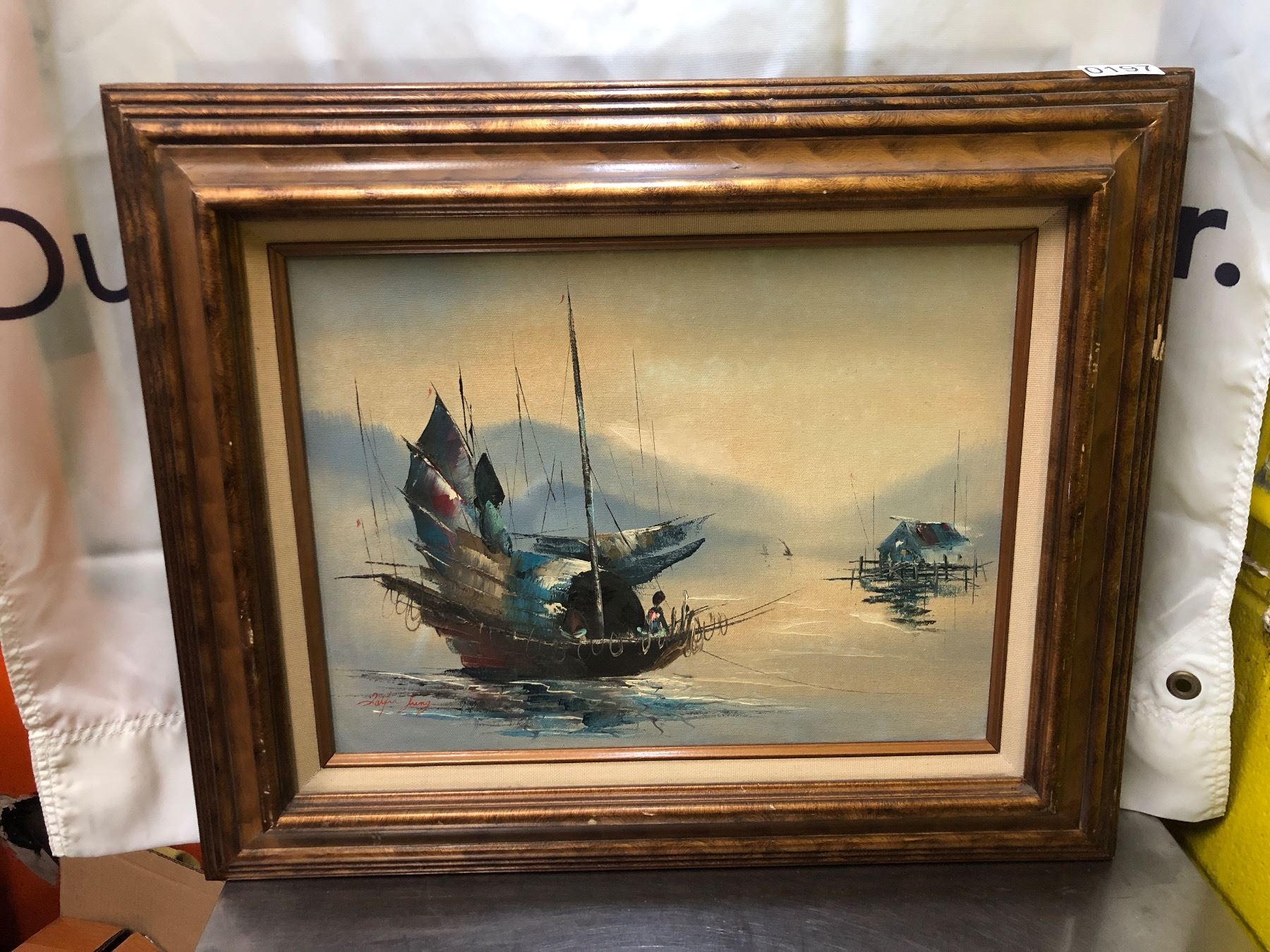 FRAMED ORIGINAL "SAILING" PAINTING ON CANVAS SIGNED BY ARTIST APPROX 22 1/2 in X 19 in