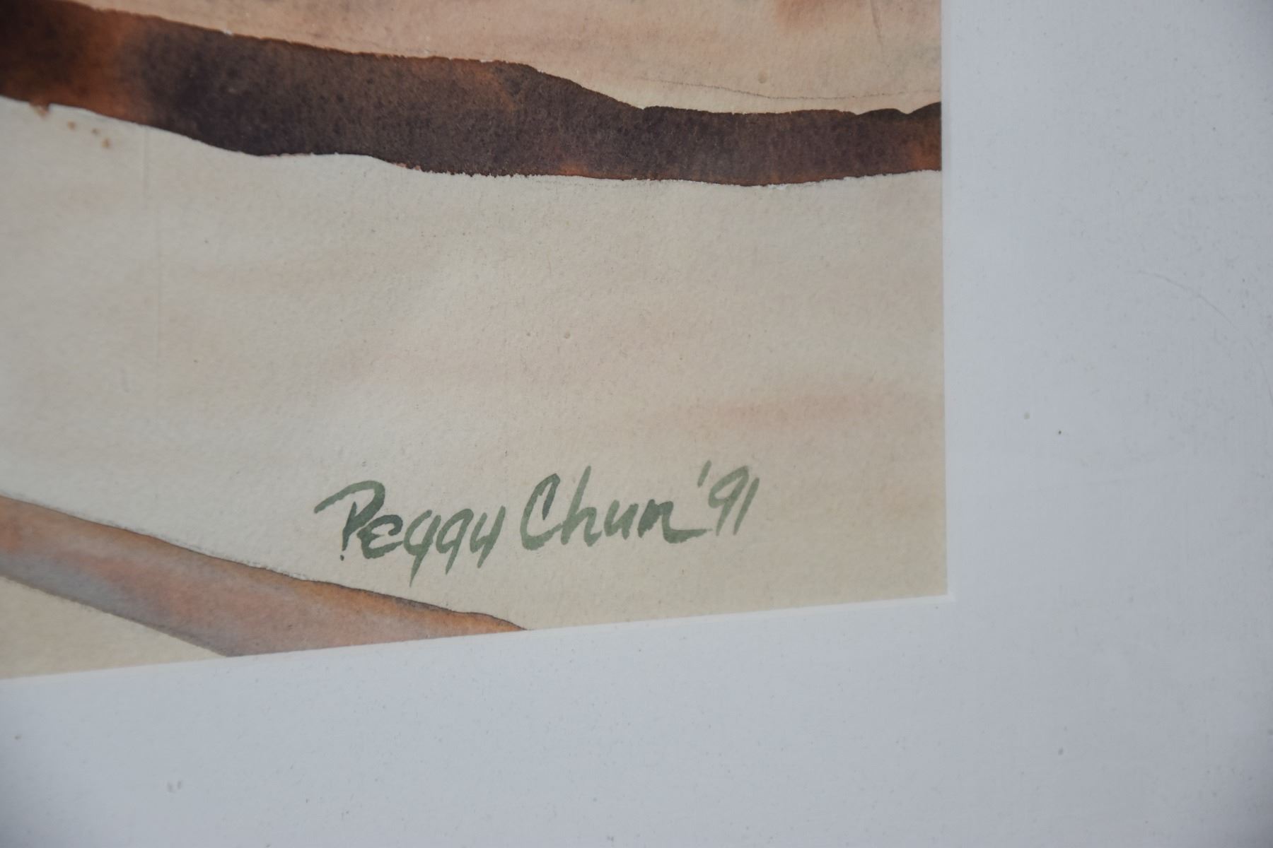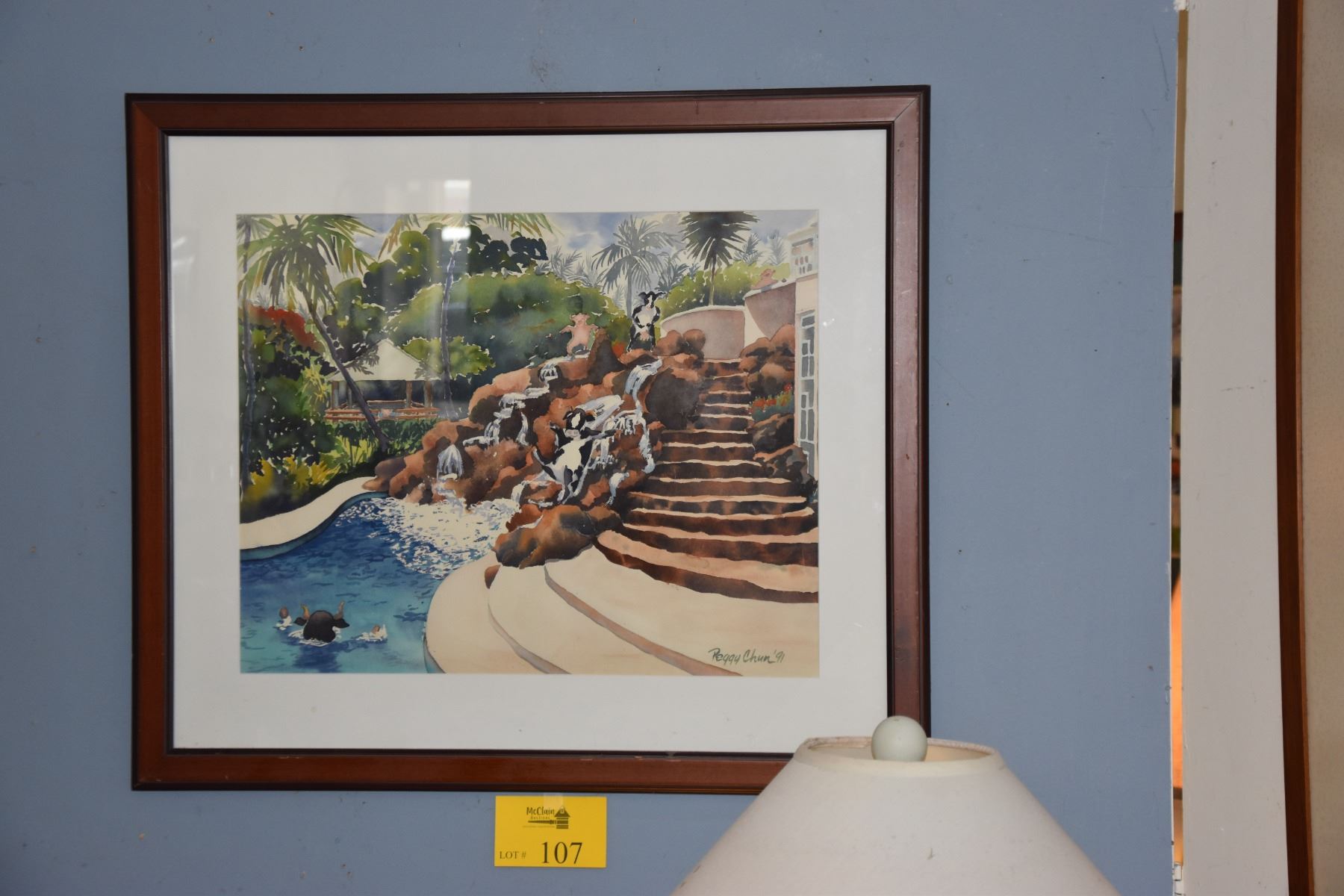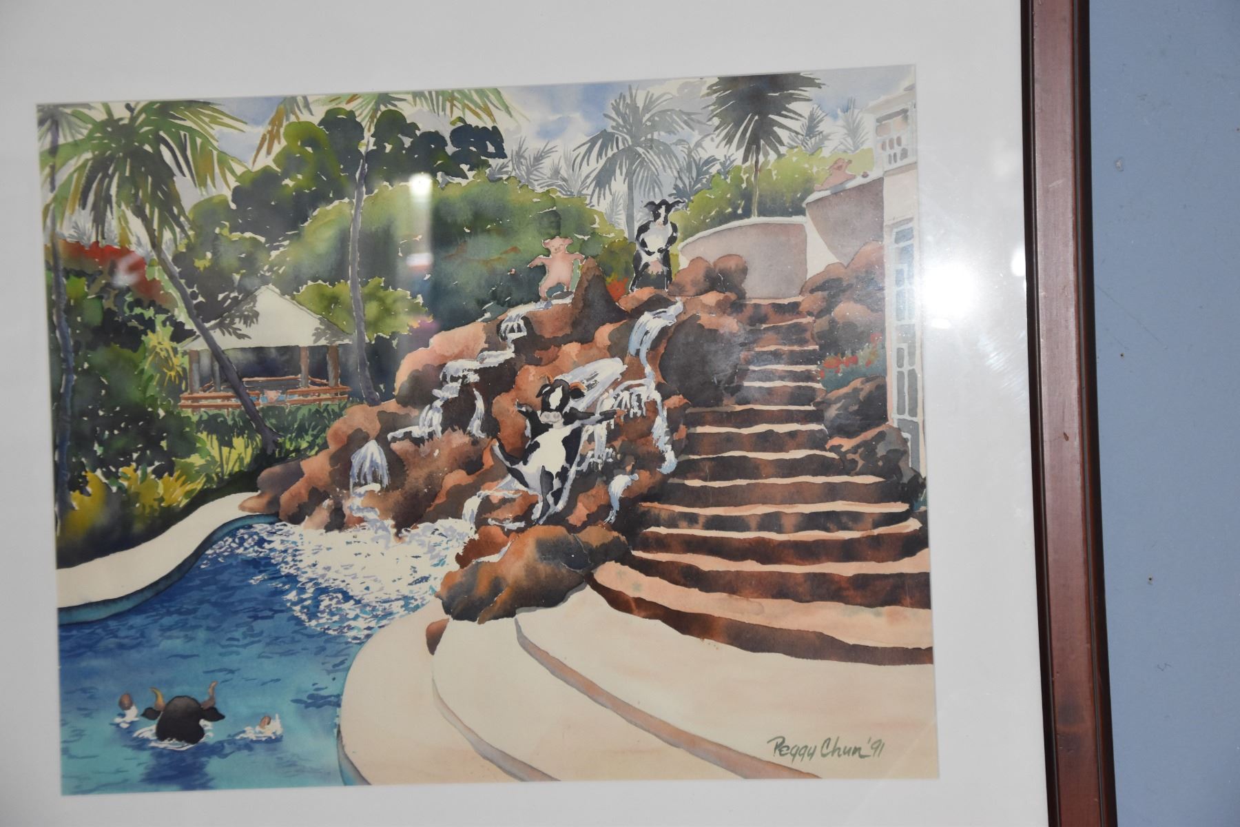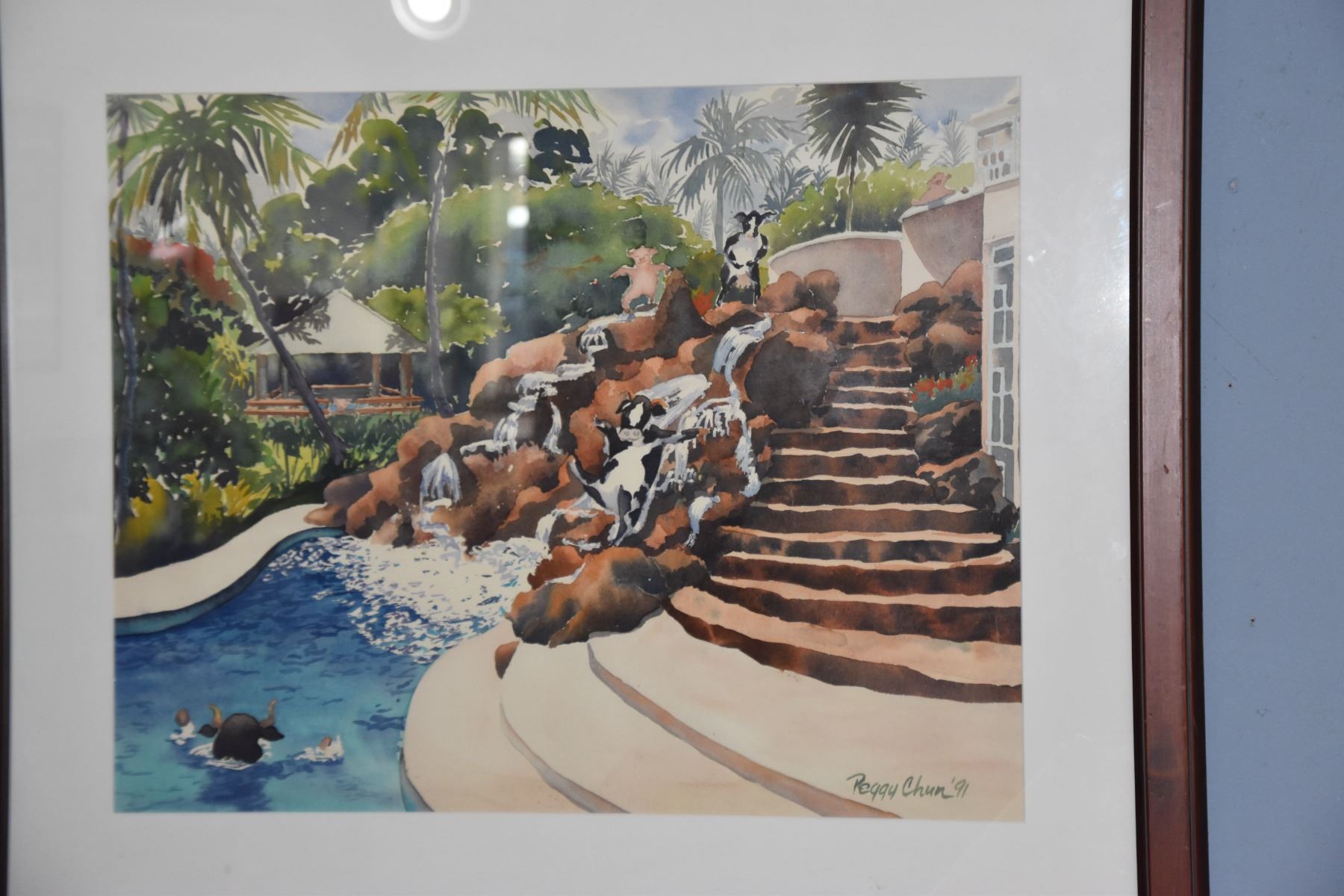 FRAMED ORIGINAL WATERCOLOR, "POOL PARTY"; SIGNED PEGGY CHUN '91 (31" X 26 3/4")