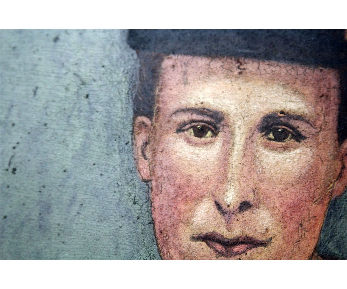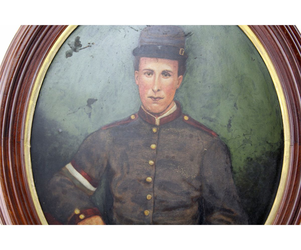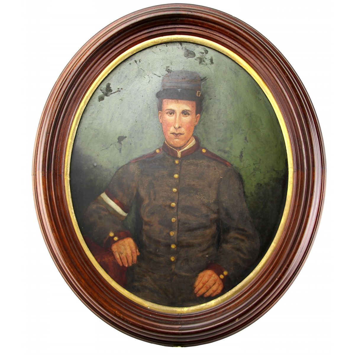 FRAMED OVAL OIL ON BOARD OF A WWI FRENCH SOLDIER Painted on thick paper board. Country: France Size: 28x24" Condition: Good with crazing and scuffs.