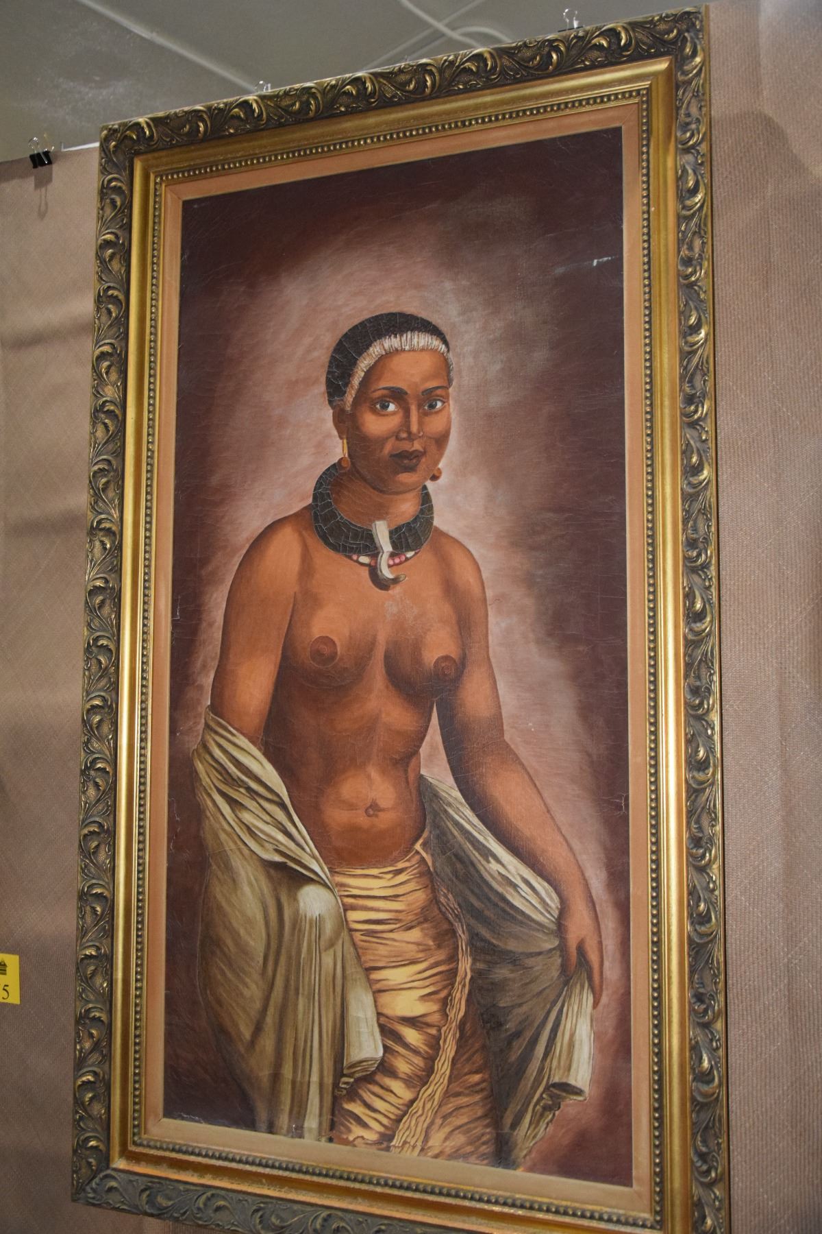 FRAMED PAINTING, "FEMME DES ISLES SANDWICH"; UNSIGNED (SOME DAMAGE) (31 1/2" X 55 1/2")