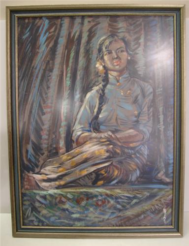 FRAMED PAINTING OF ASIAN FEMALE. Depicts a seated Asian female. Signed illegibly in lower right. 24.5” x 32.5” framed