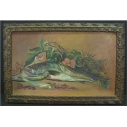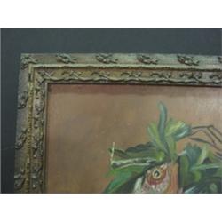 FRAMED OIL ON BOARD PAINTING OF FISH. Unsigned. Shingle back. 21.25" x 14.25" framed.