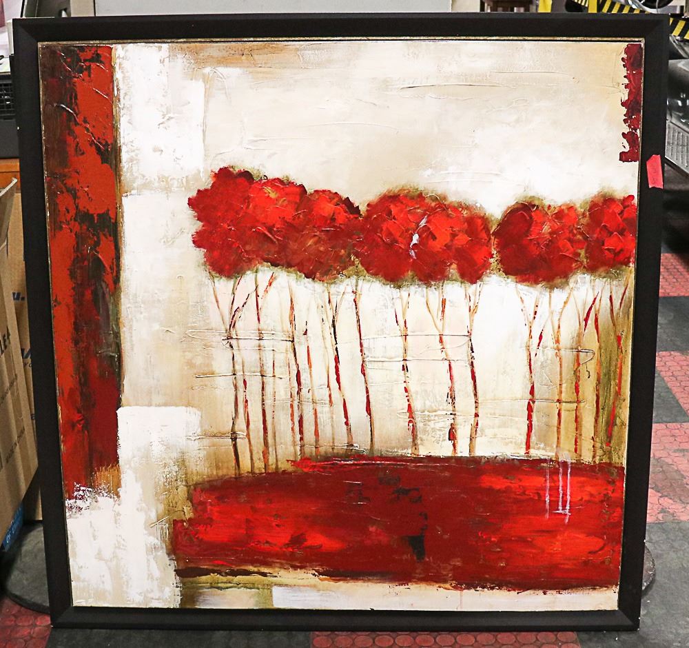 FRAMED PAINTING OF RED TREES ON CANVAS 43" X 43"