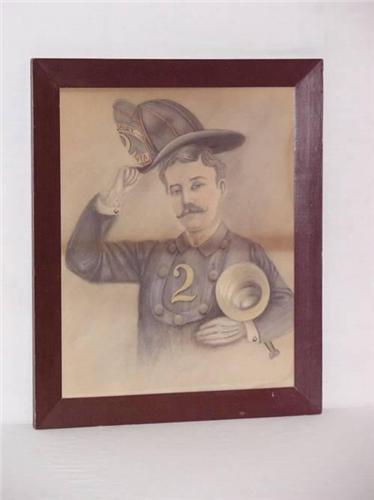 FRAMED PASTEL DRAWING OF FIREMAN IN BIB SHIRT W/ HIGH EAGLE HELMET - SBURY VFA HOLDING TRUMPET (17" X 21") - MINOR FOXING;
