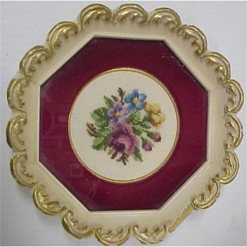GORGEOUS NEEDLEWORK, PETIT POINT PICTURE, FRAMED IN GOLD ACCENTED ANTIQUE WHITE WOOD FRAME, LOVE THE BURGUNDY VELVET FRAMING THE BEAUTIFUL BOUQUET OF FLOWERS.EXCELLENT CONDITION but for a small damage on the frame as per picture.US BUYER PLEASE PAY 8.00 FOR SHIPPING PLUS INSURANCE.THANKS FOR LOOKING!