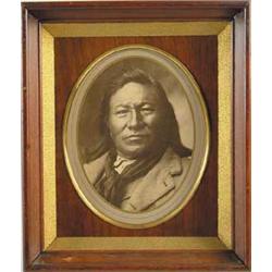 FRAMED PHOTOGRAPH OF FAMED SIOUX CHIEF RAIN IN THE FACE. Nicely framed and matted photograph 10-1/2” x 8-1/2”) of Rain in the Face Itonagaju), a famous Hunkpapa Sioux chief. He was a fierce fighter and took part in the most famous battles of the Indian wars, including the Fetterman Massacre at Fort Kearny and the Battle of the Little Big Horn. Although nobody knows for certain who killed General Custer, many people including Custer’s widow believed that Rain in the Face killed him. There were also rumors that he cut out the heart of General Custer’s brother Tom on that battlefield, because Tom had previously captured and imprisoned him at Fort Abraham Lincoln. Rain in the Face denied doing this in an interview with Charles Eastman shortly before his death. CONDITION: Frame has a few scuffs - otherwise excellent. 8-87209 SO24