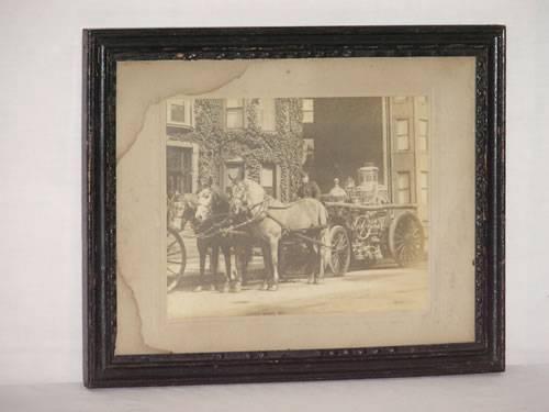 FRAMED PHOTOGRAPH OF HORSE DRAWN STEAM FIRE ENGINE, ON MAT (8" X 10") - TONING and STAINS;
