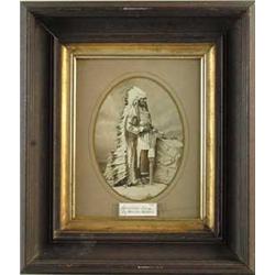 FRAMED PHOTOGRAPH OF SIOUX CHIEF AMERICAN HORSE. Framed and matted 7-1/2” x 5-1/2” photo with pencil notation on back indicating stock # 840 by Alexander Gardner and identifying the subject as American Horse, Oglala Sioux. American Horse was one of the more reasoned, conciliatory of the Sioux chiefs, and encouraged his followers to cooperate with the demands of the whites in order to prevent the annihilation of their tribes. He was an eloquent speaker and was influential in keeping the peace, especially during the uprisings surrounding the Ghost Dance movement. Photographer Alexander Gardner was Matthew Brady’s assistant, he was appointed to the staff of Gen. George McClellan as a Captain. His photographs of the battles of Antietam, Fredricksburg, Gettysburg, and Petersburg, among others, are classics and he published a two-volume set of them after the war. He later became the official photographer of the Union Pacific Railroad and took many photographs of Western scenes and people, including notable Native Americans. CONDITION: Very good. 8-87210 SO25