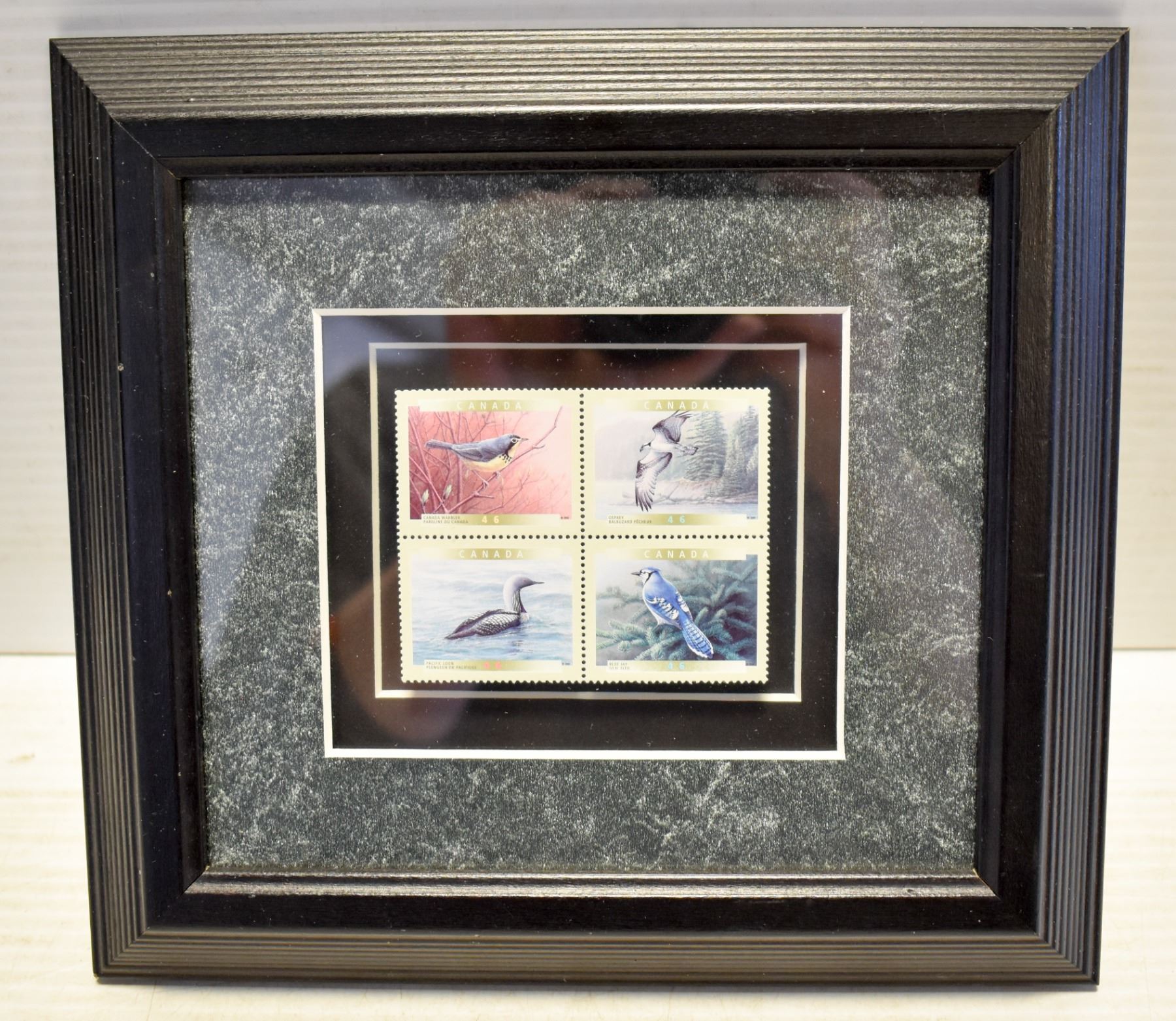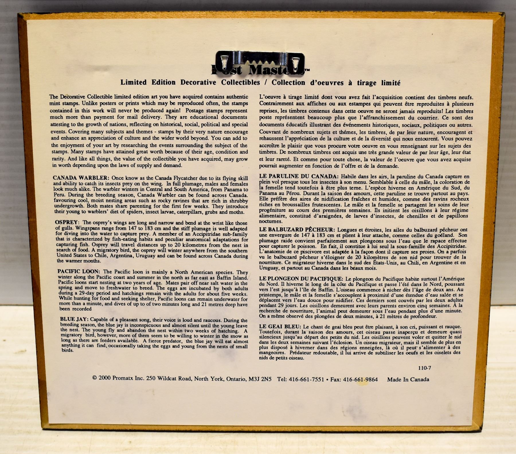 MINT STAMPS 2000 LIMITED EDITION CANADA WARBLER, OSPREY, PACIFIC LOON, BLUE JAY 8" X 8" W/COA AT BACK