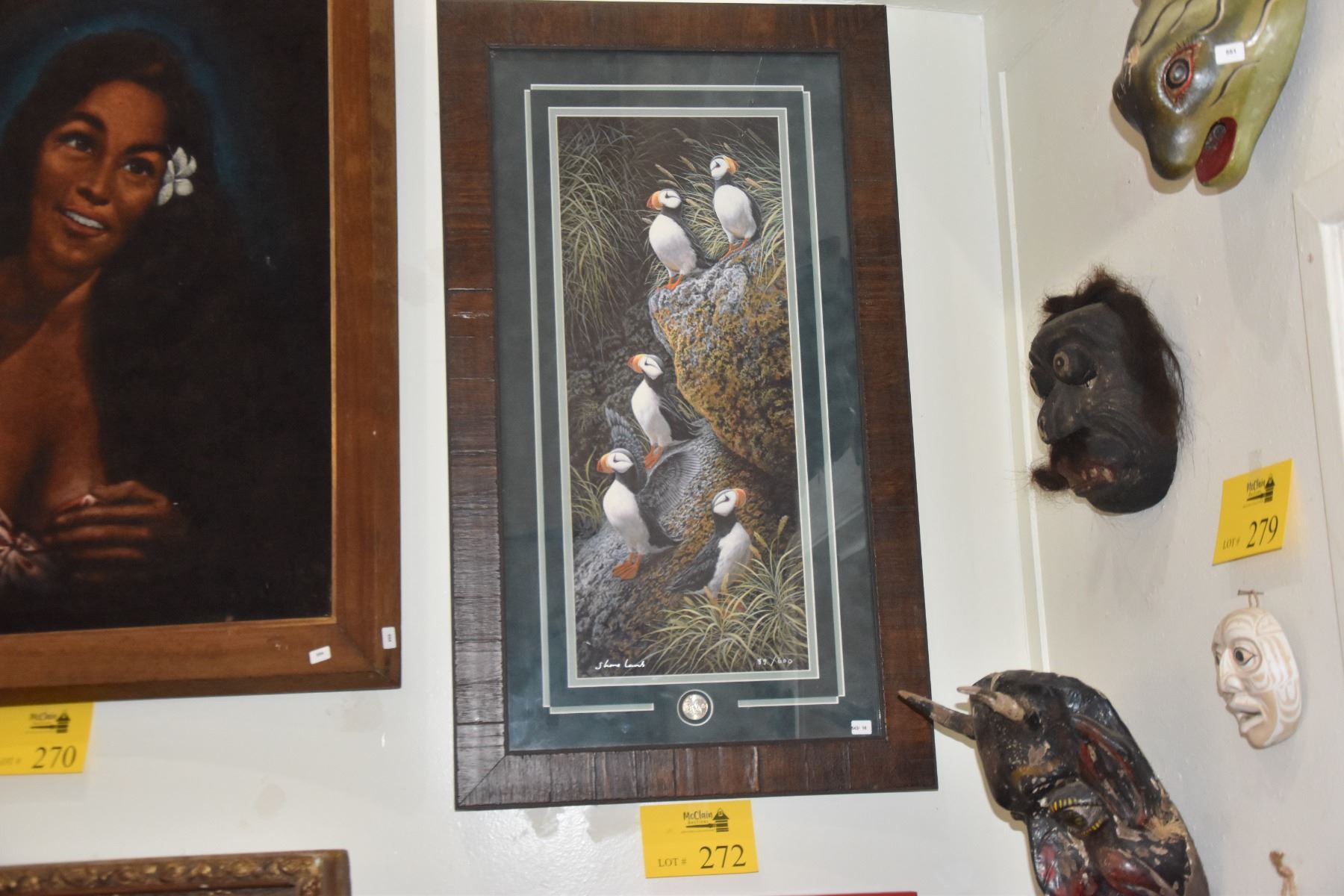 FRAMED SHANE LAMB ARTIST MATTED SIGNED PRINT, PUFFINS, W/COIN (18" X 31")