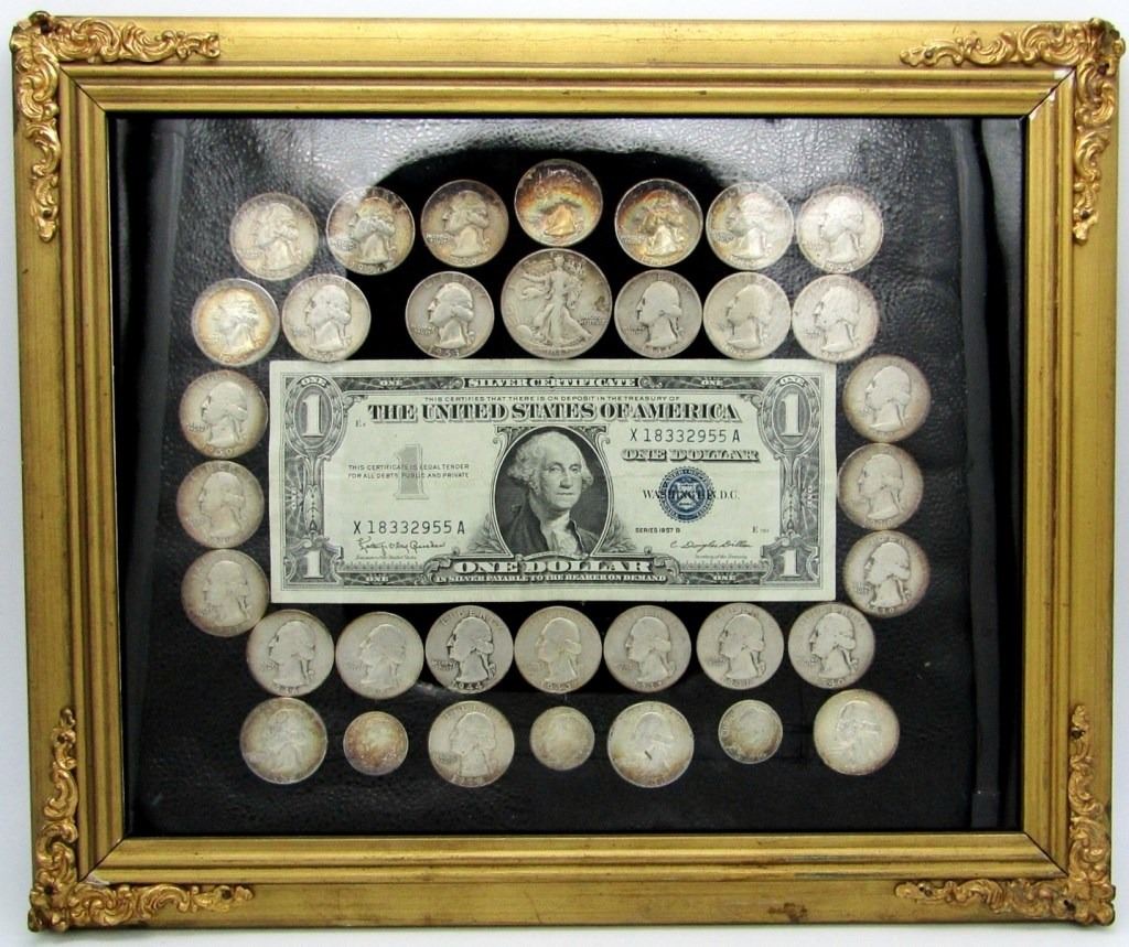 No 1949 (30 TOTAL) ; 1942 WALKING LIBERTY HALF DOLLAR; 3 SILVER DIMES; 1957B SILVER CERTIFICATE in VINTAGE FRAME