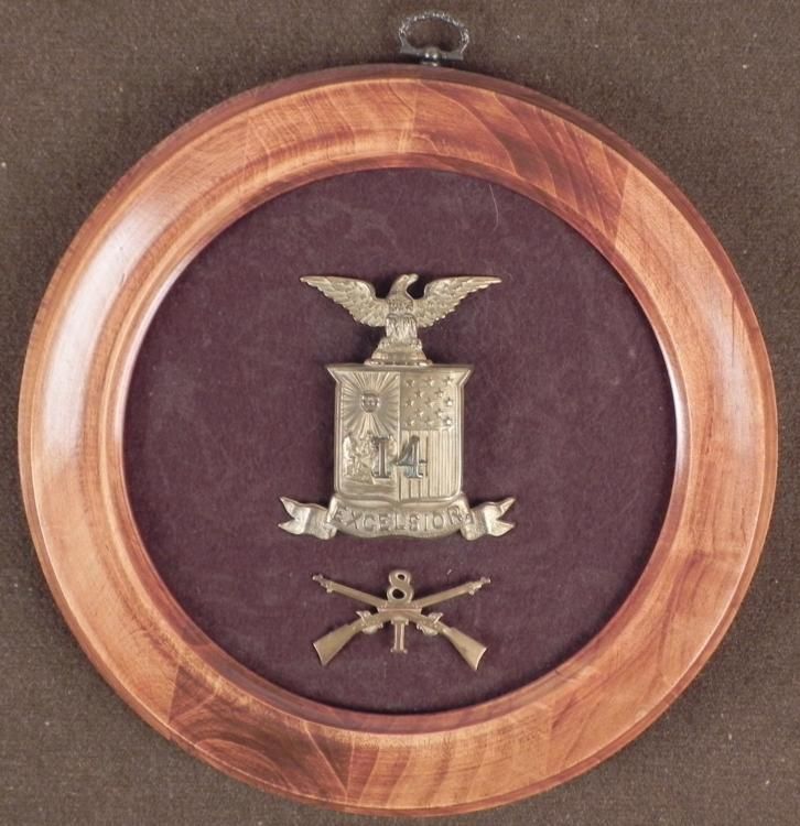 FRAMED SPANISH AMERICAN WAR 14TH NEW YORK RESERVES HAT DEVICE+8TH INFANTRY UNIFORM INSIGNIA * NICE ORIGINAL DISPLAY FROM THE SPAN-AM WAR.-DIAMETER:10" *