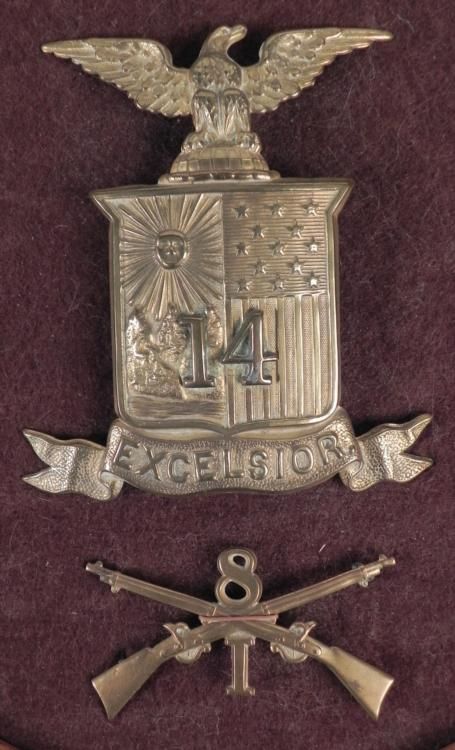 FRAMED SPANISH AMERICAN WAR 14TH NEW YORK RESERVES HAT DEVICE+8TH INFANTRY UNIFORM INSIGNIA * NICE ORIGINAL DISPLAY FROM THE SPAN-AM WAR.-DIAMETER:10" *